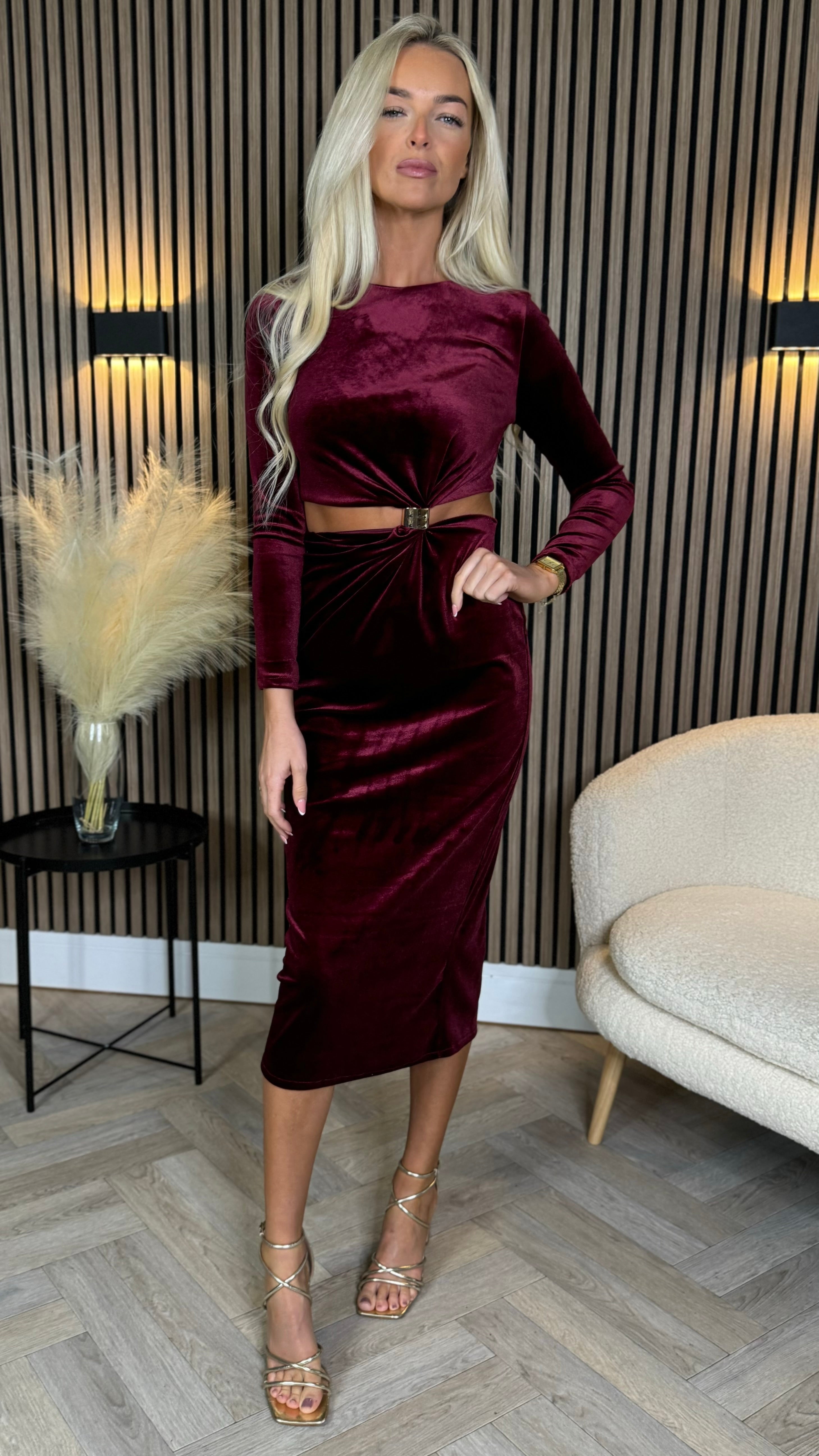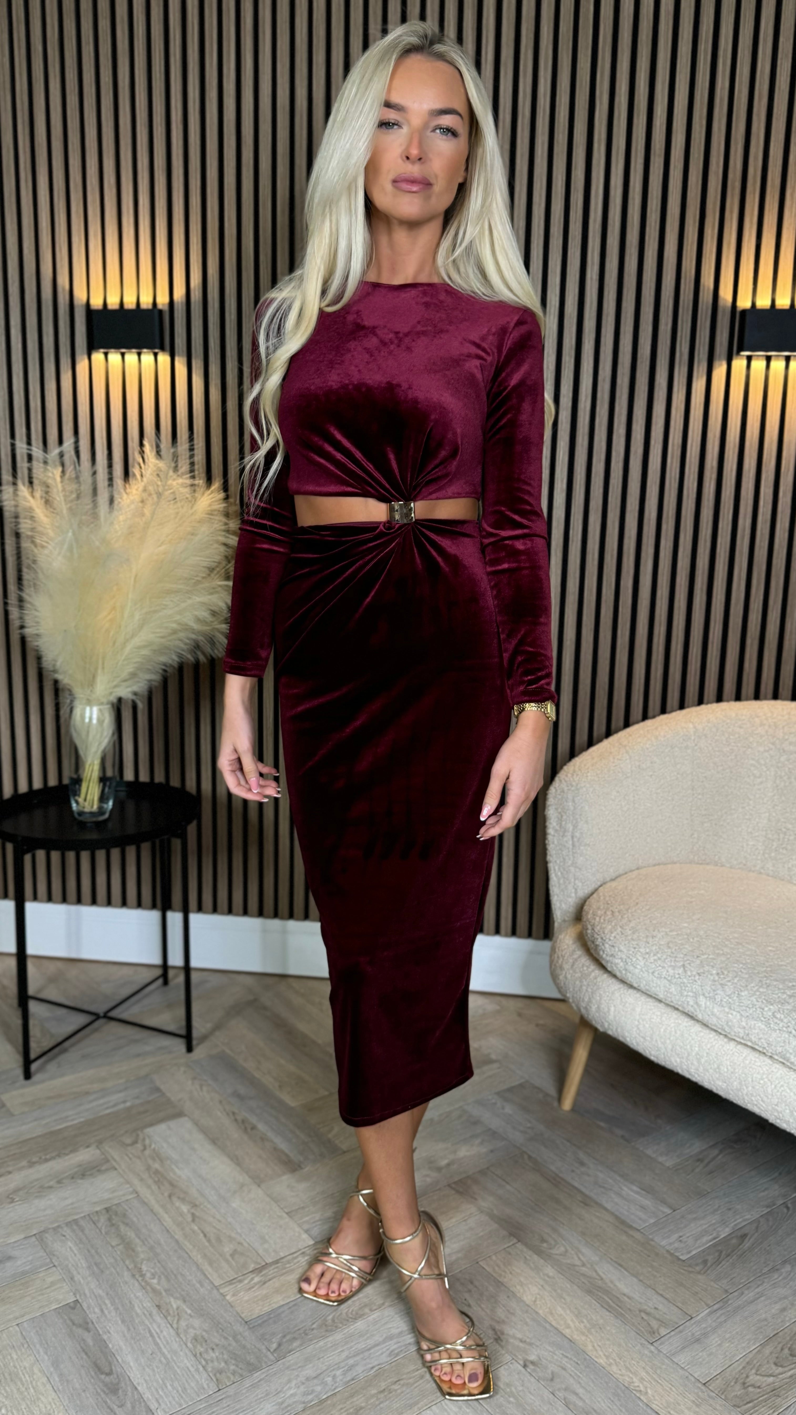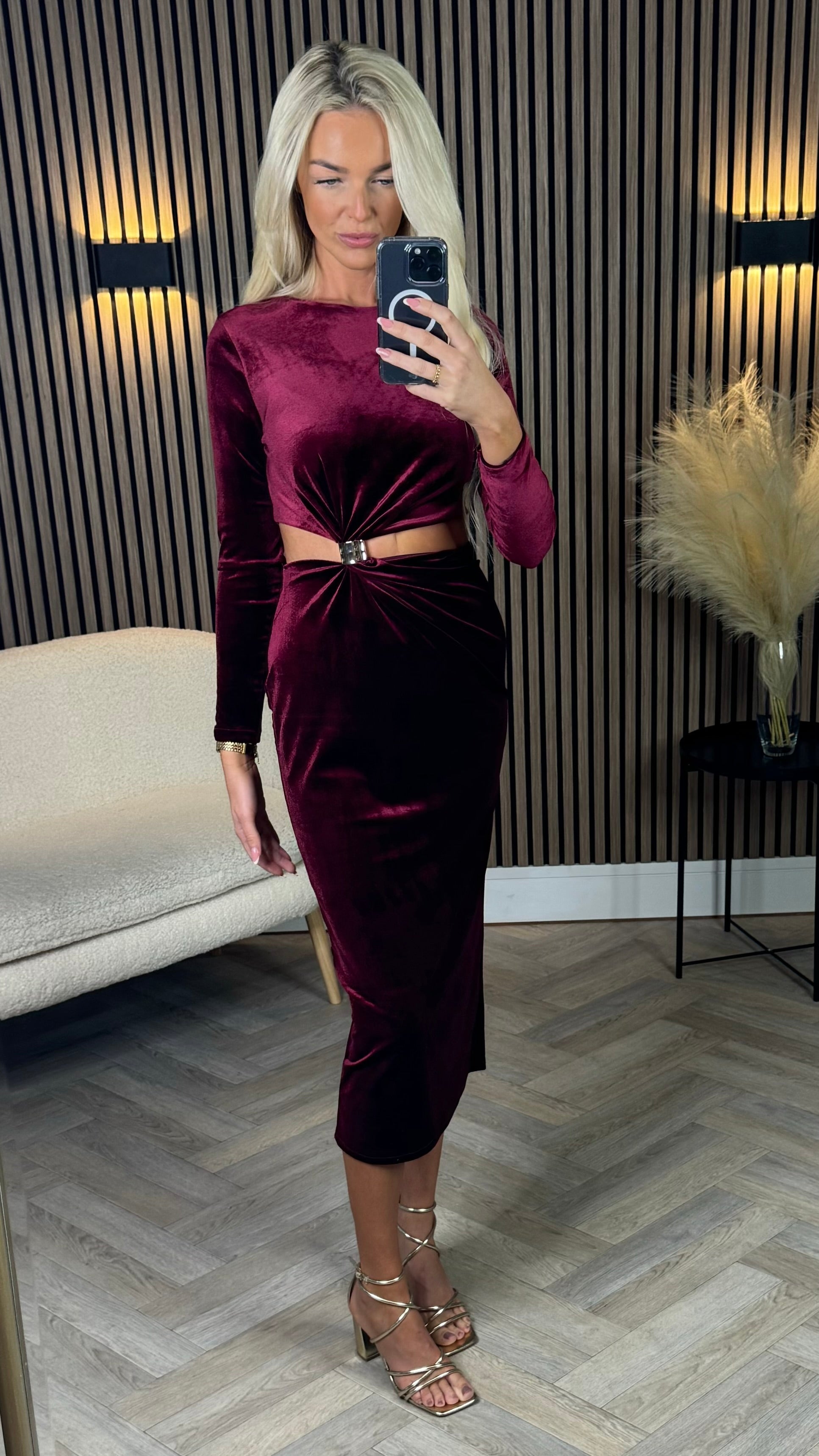 Be flirty in the Saskia Burgundy Cut Out Detail Midi Dress! This midi dress features ruched and cut out details for a playful touch, while the gold clasp adds a touch of glam. Perfect for date night or a girls' night out, it's a must-have for your wardrobe! 💃