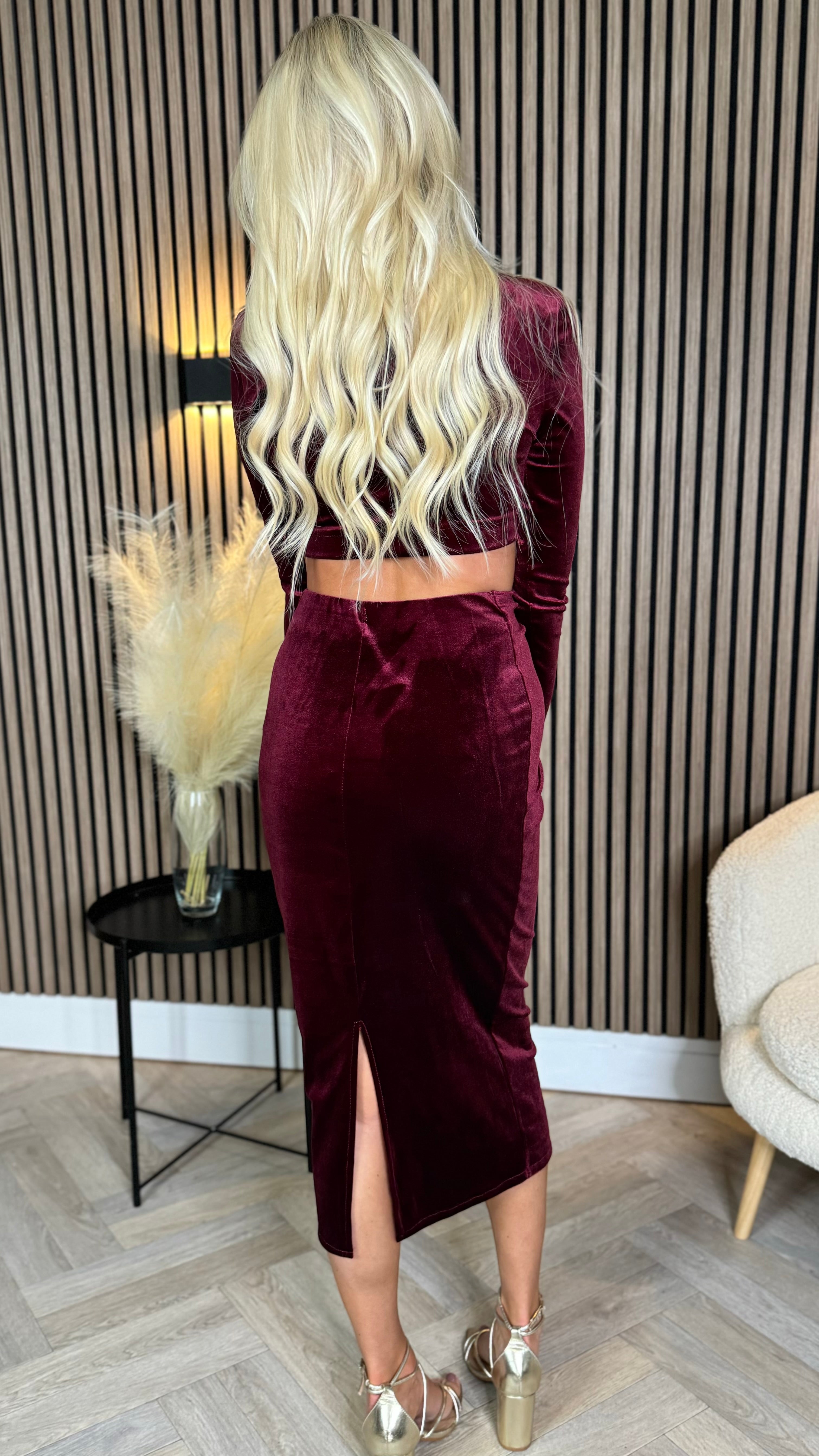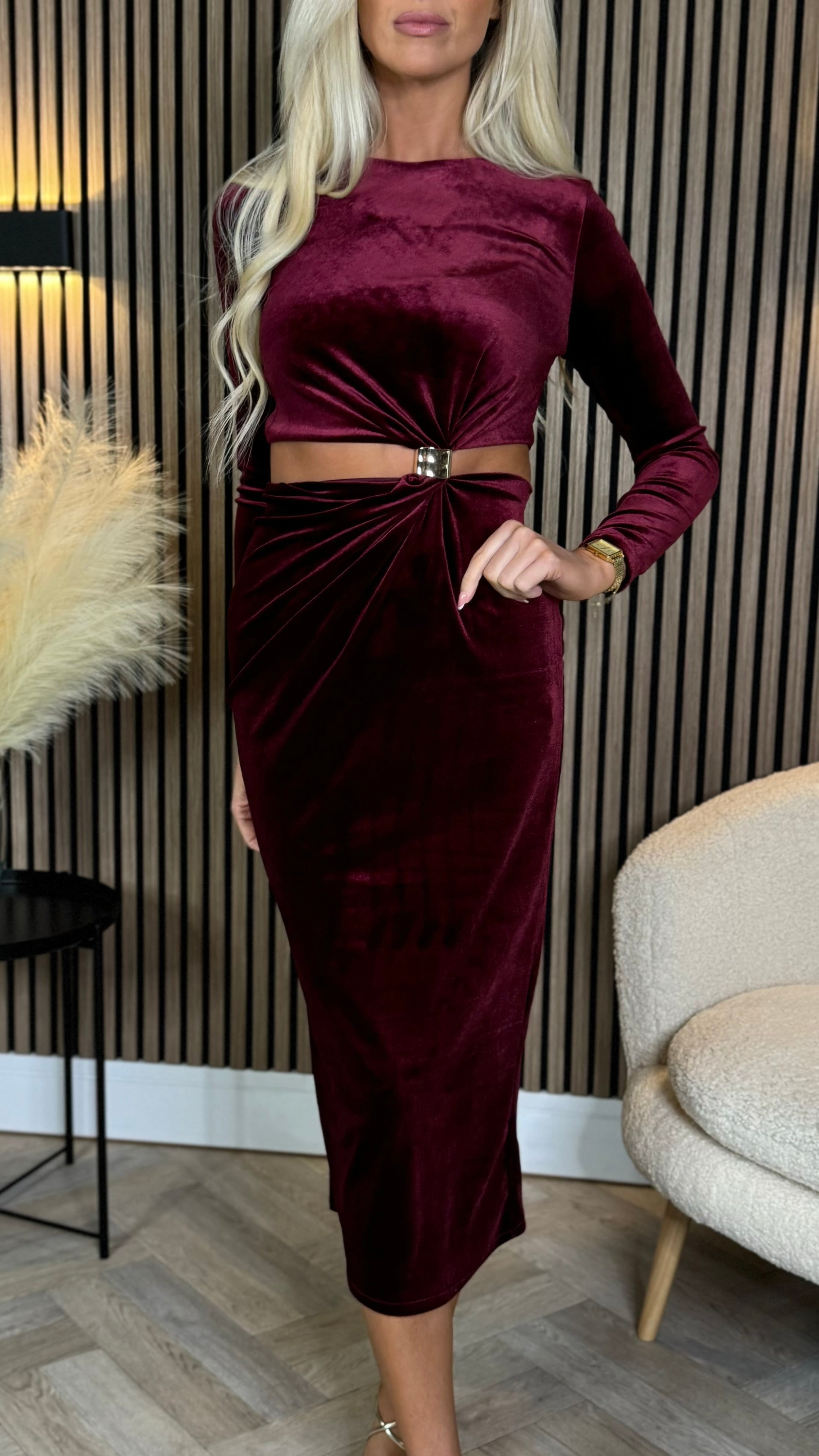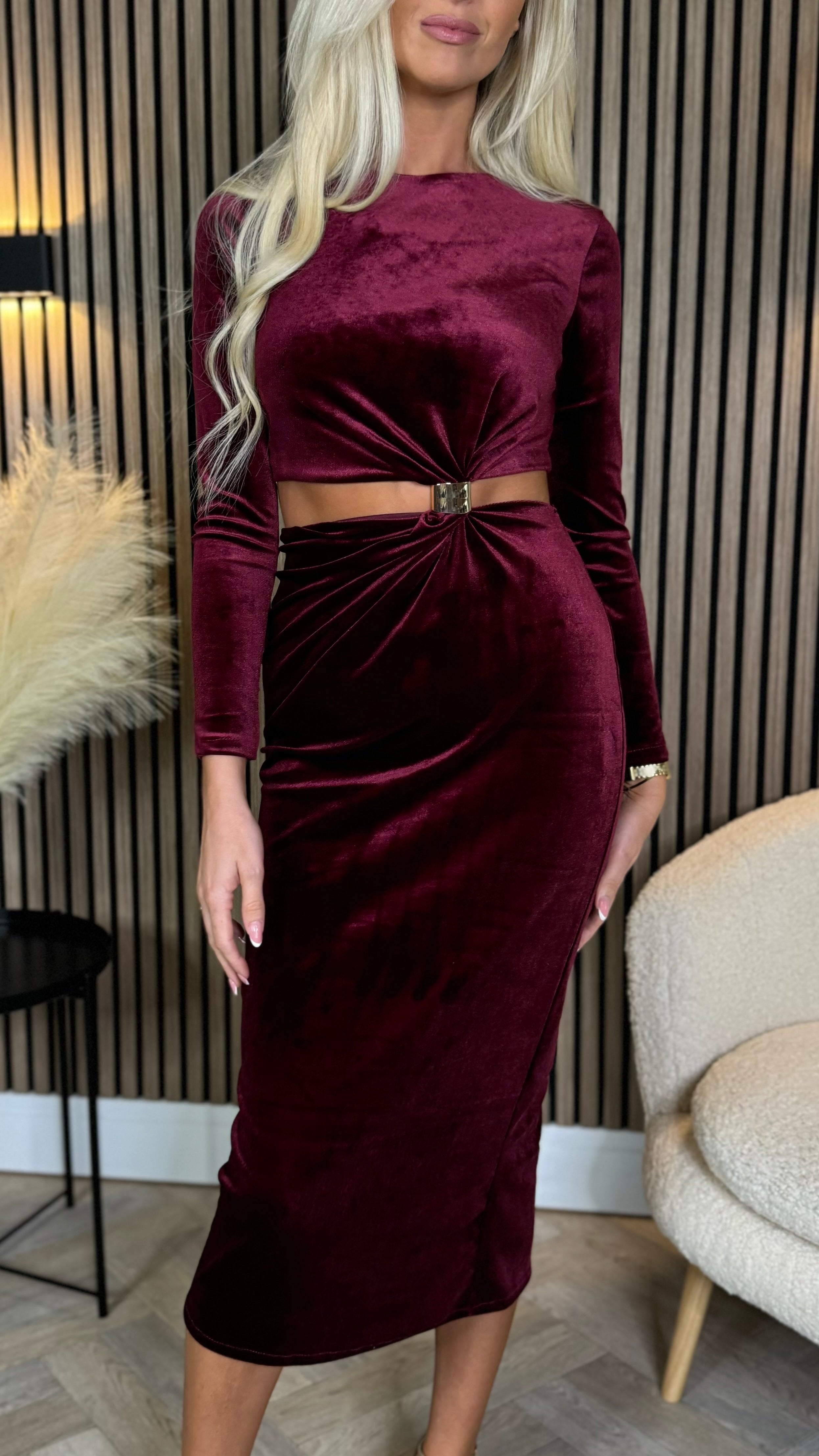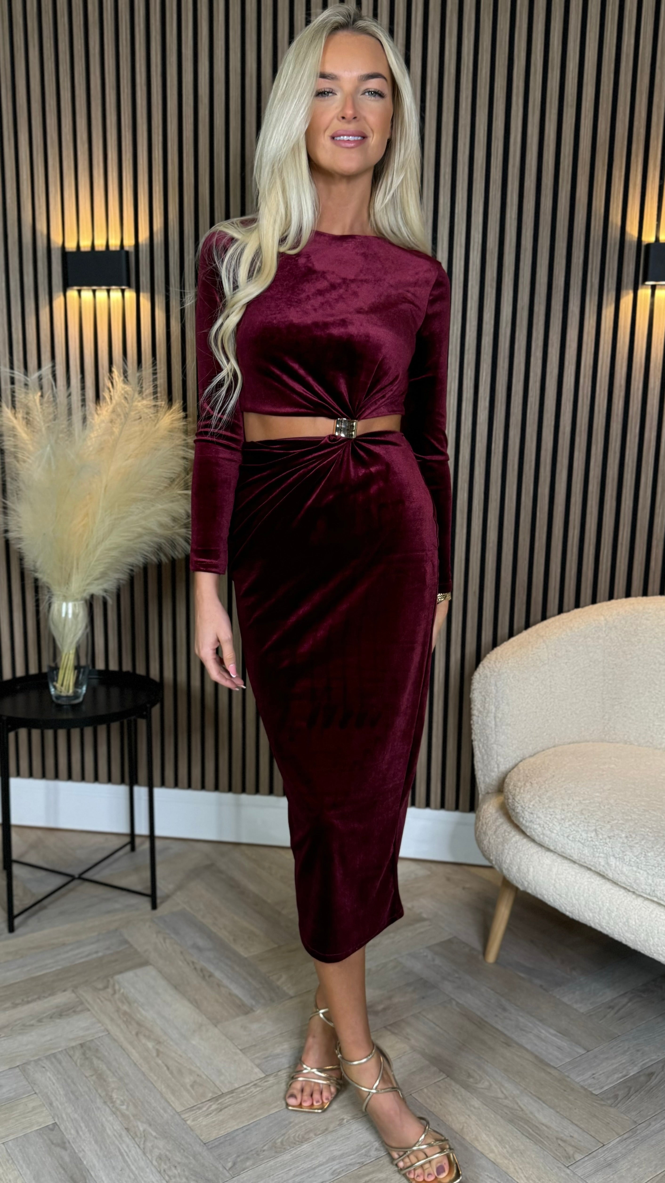 Be flirty in the Saskia Burgundy Cut Out Detail Midi Dress! This midi dress features ruched and cut out details for a playful touch, while the gold clasp adds a touch of glam. Perfect for date night or a girls' night out, it's a must-have for your wardrobe! 💃