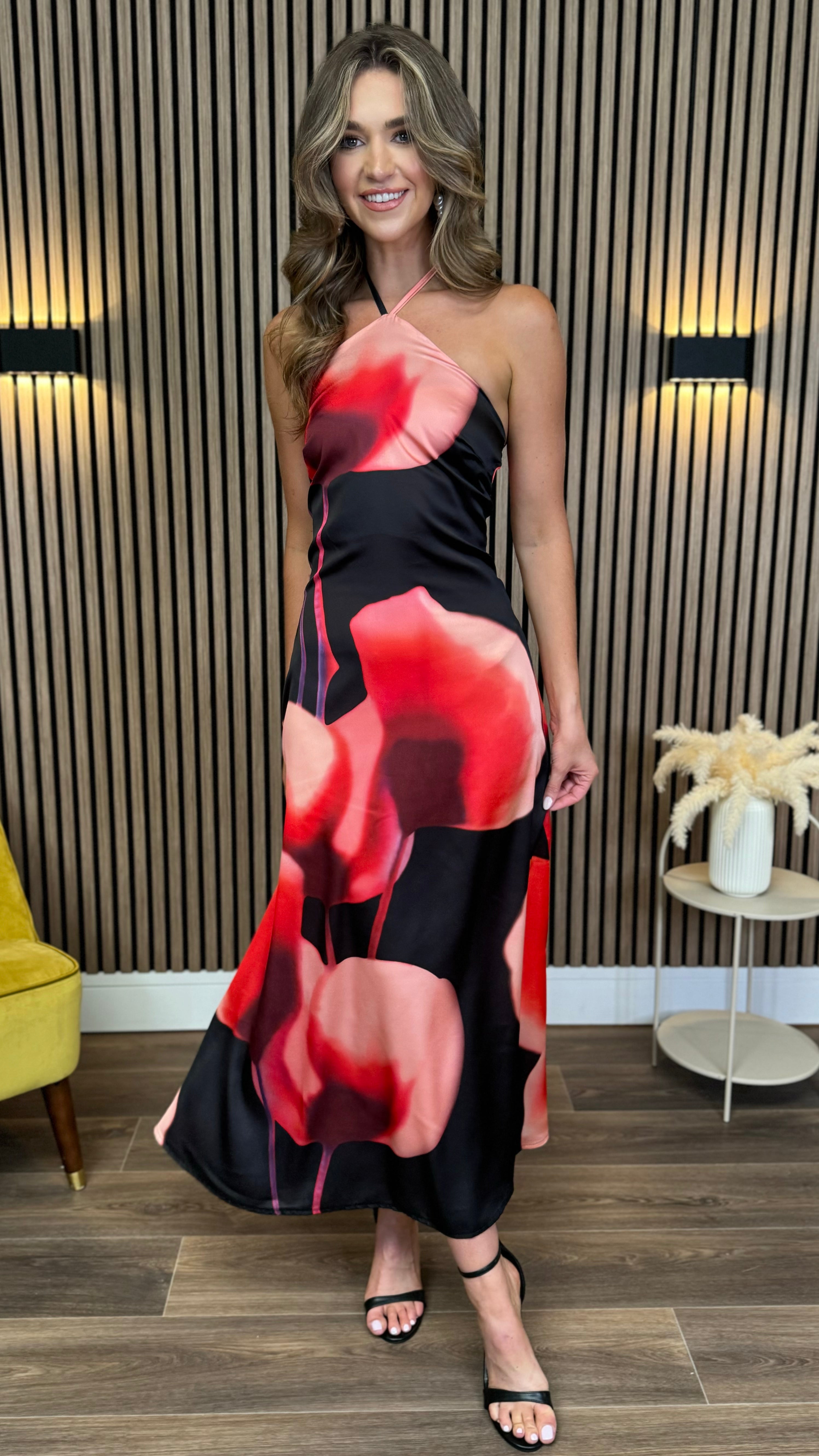 Selma Black & Peach Floral Detail Halterneck Satin Detail Midi Dress