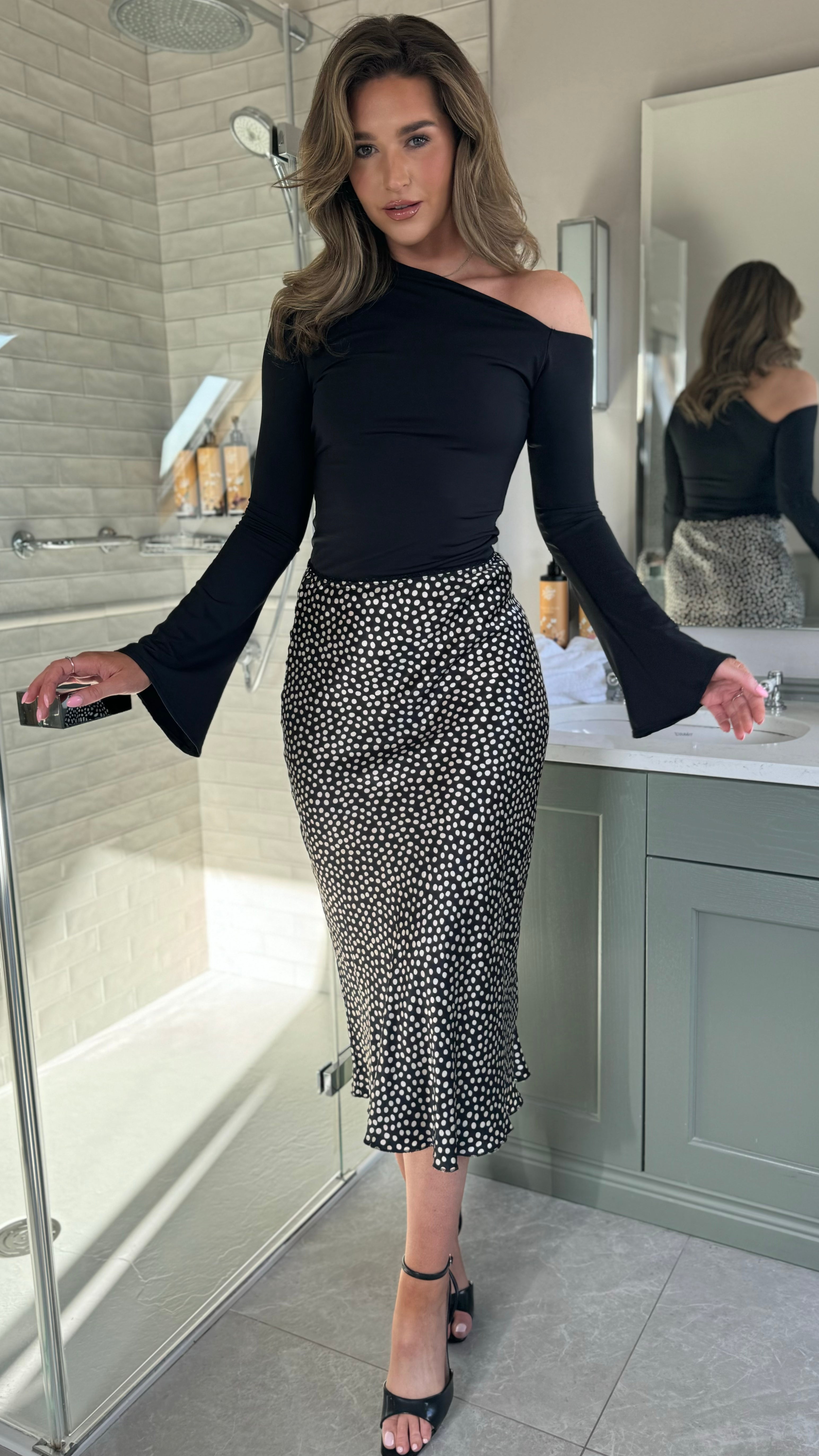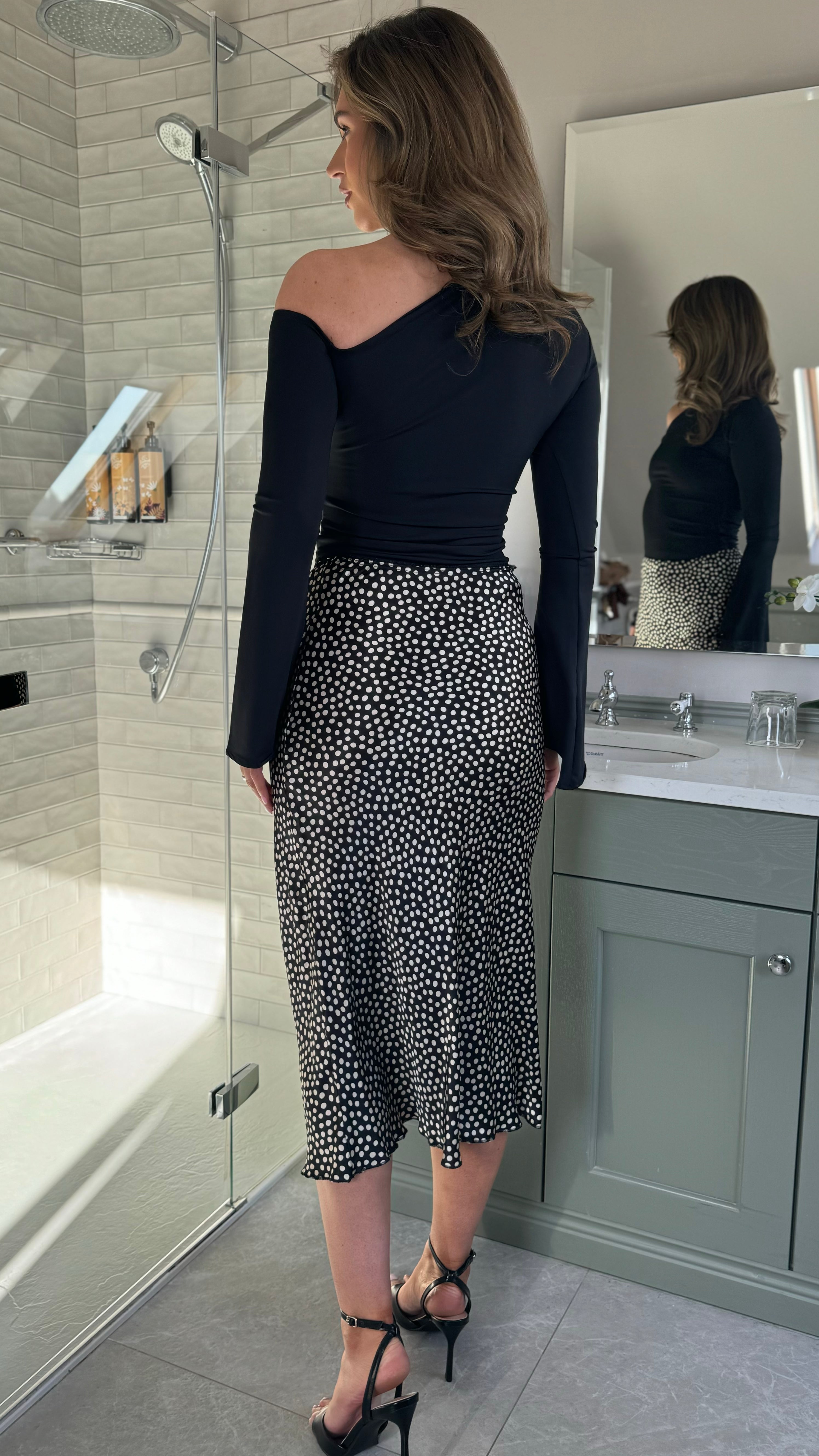 Effortless elegance meets everyday comfort in this printed slip skirt. The delicate lace trim waistband adds a touch of refinement, while the slip silhouette drapes beautifully for a flattering, versatile look. Perfect layered under sheer tops or worn solo, this piece transitions seamlessly from day to night. The polka dot print brings playful sophistication to your wardrobe—a modern essential that works harder than it looks.