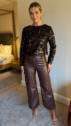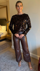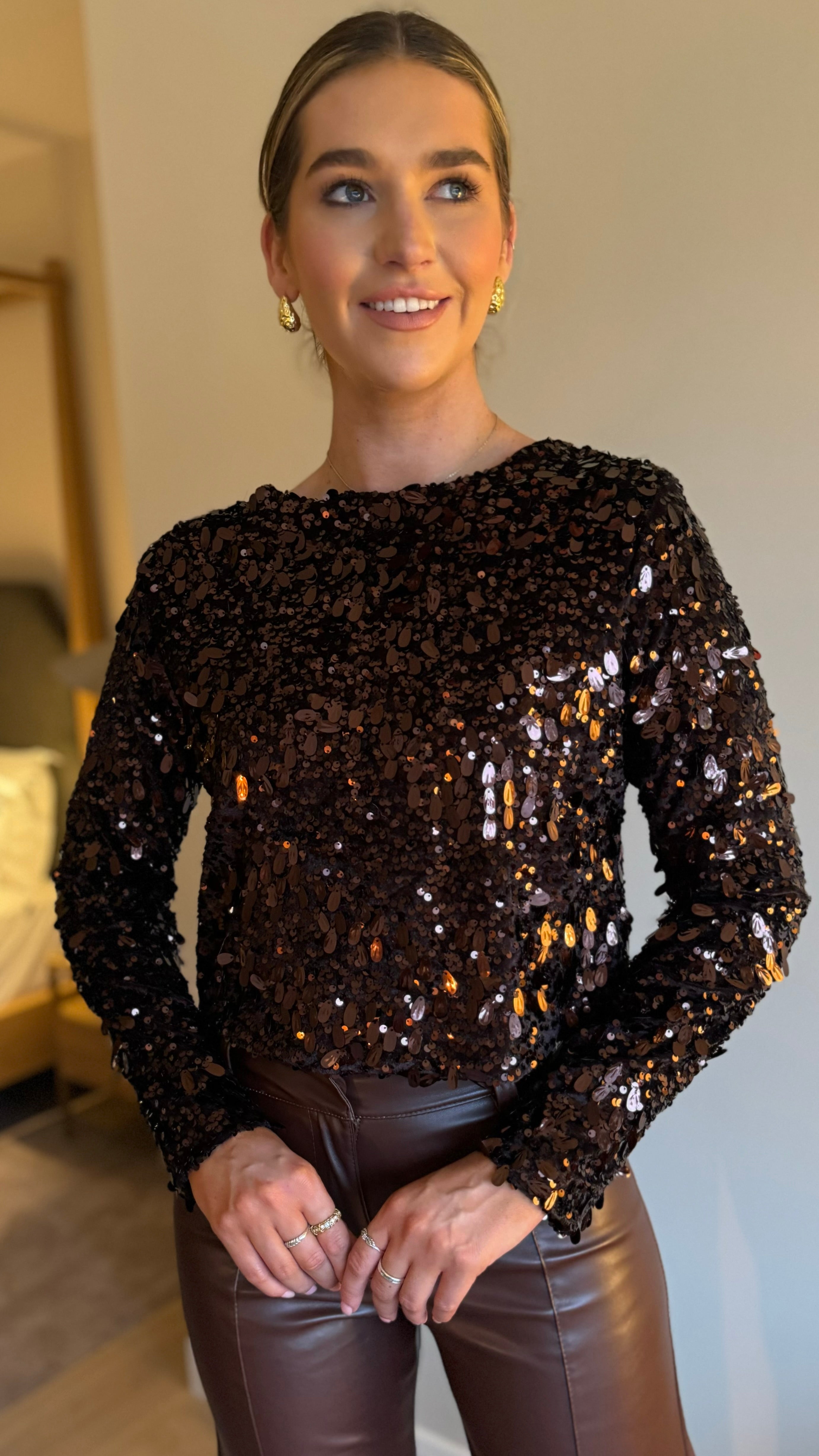 Unleash your inner fashionista with Sunniva's Brown Sequin Long Sleeve Top. Featuring a hook and eye fastening and the ability to switch between front and back wear, this round-necked, long-sleeved, cropped stunner is sure to make a statement. Get ready to shine in every setting!