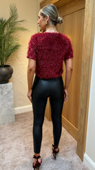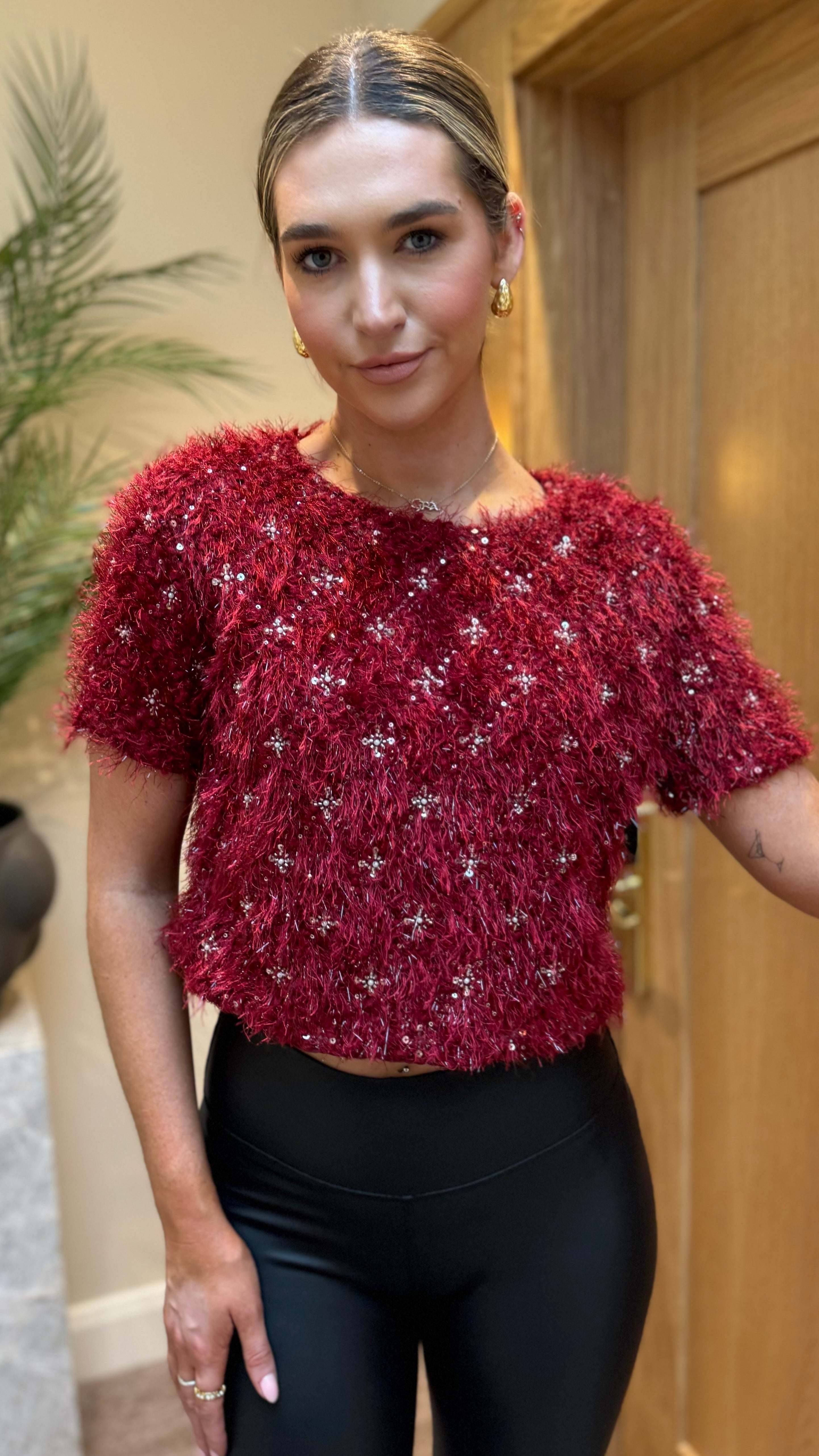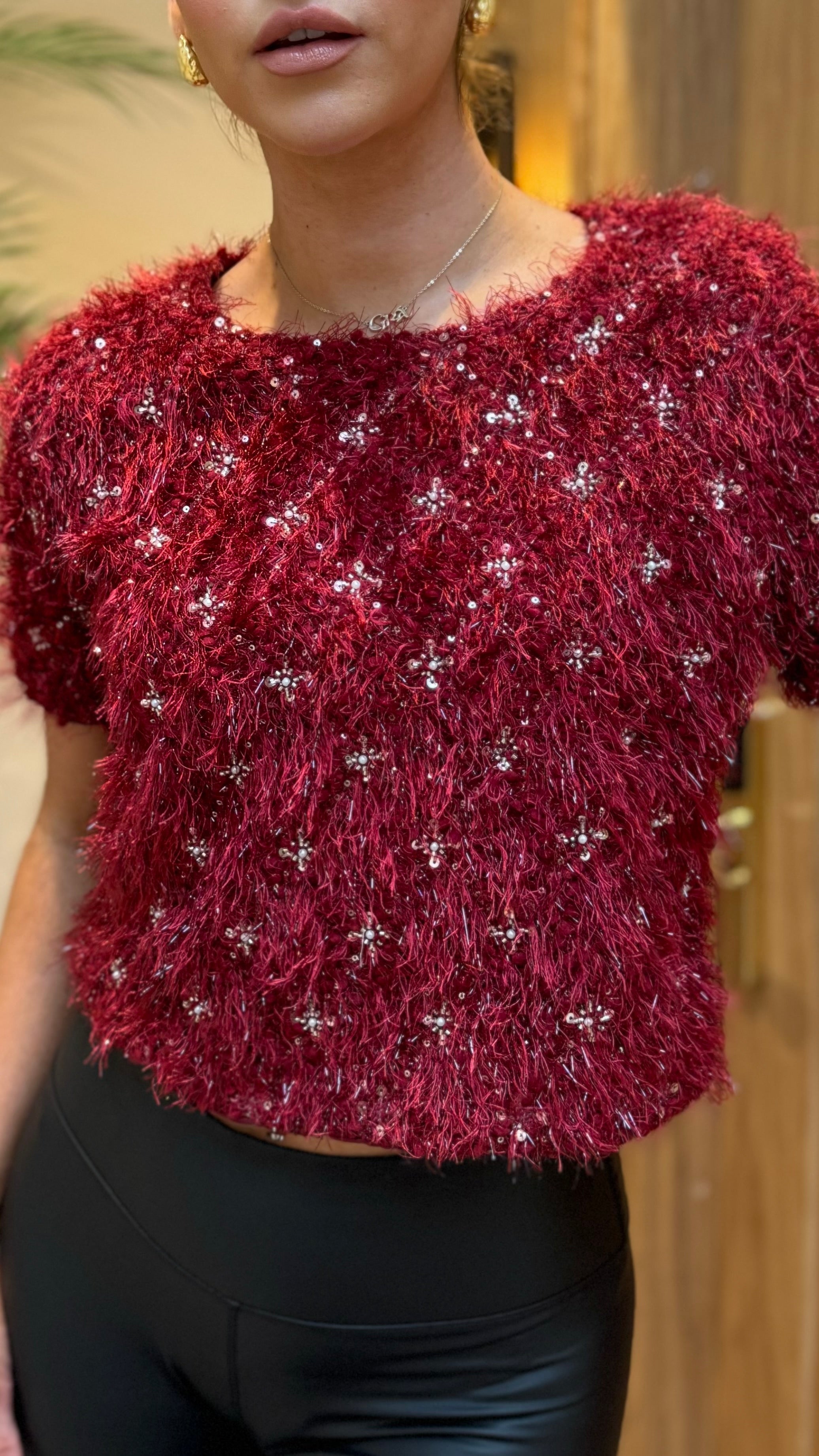 Elevate your wardrobe with this playful burgundy crop top featuring irresistible pearl embellishments and a luxuriously fluffy textured finish. The short sleeves keep things breezy while the cropped silhouette flatters your frame. Perfect for adding a touch of sparkle to casual outfits or dressing up your weekend look. A fun, flirty piece that brings personality to any ensemble.