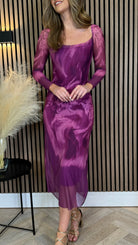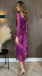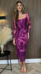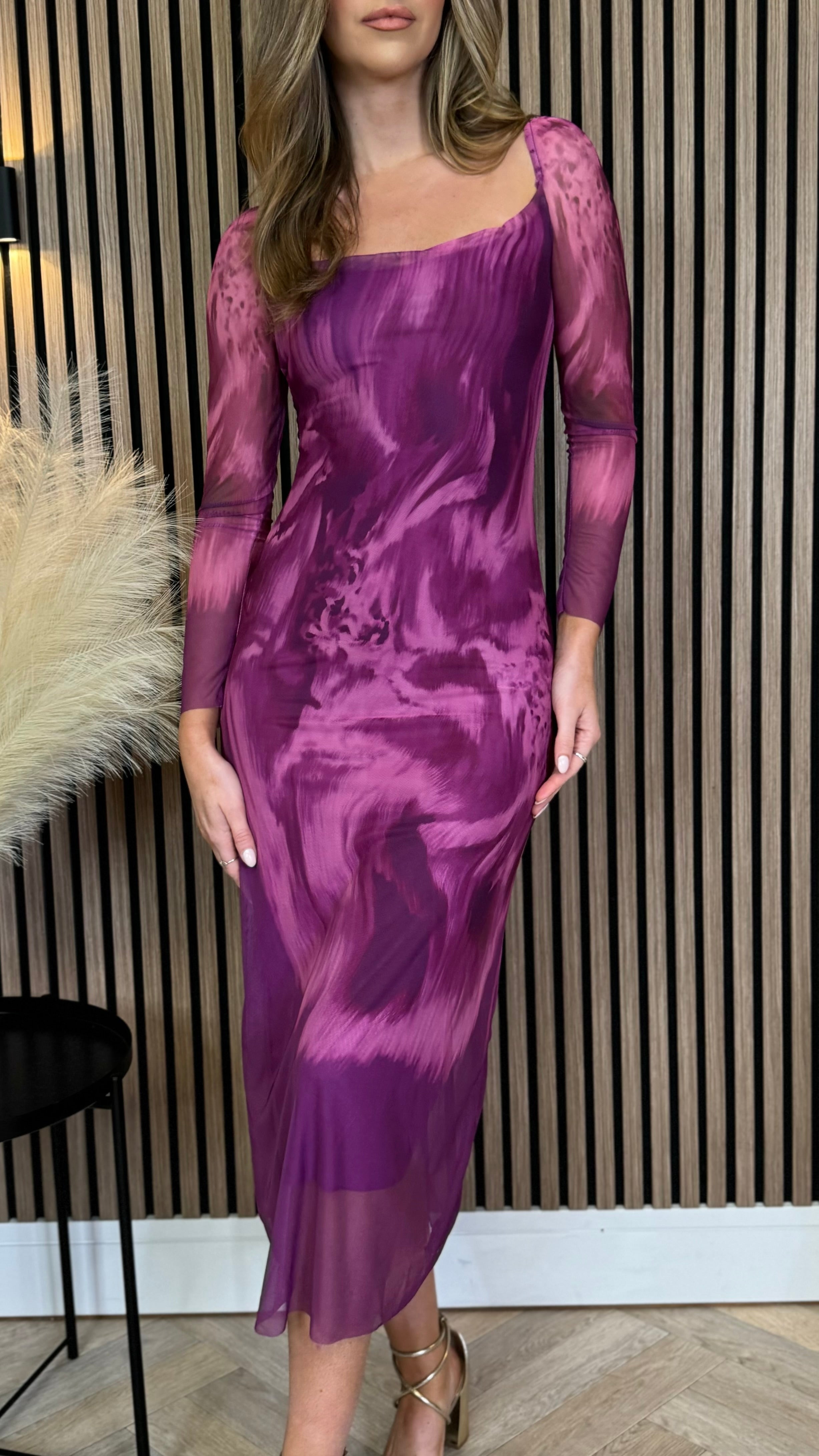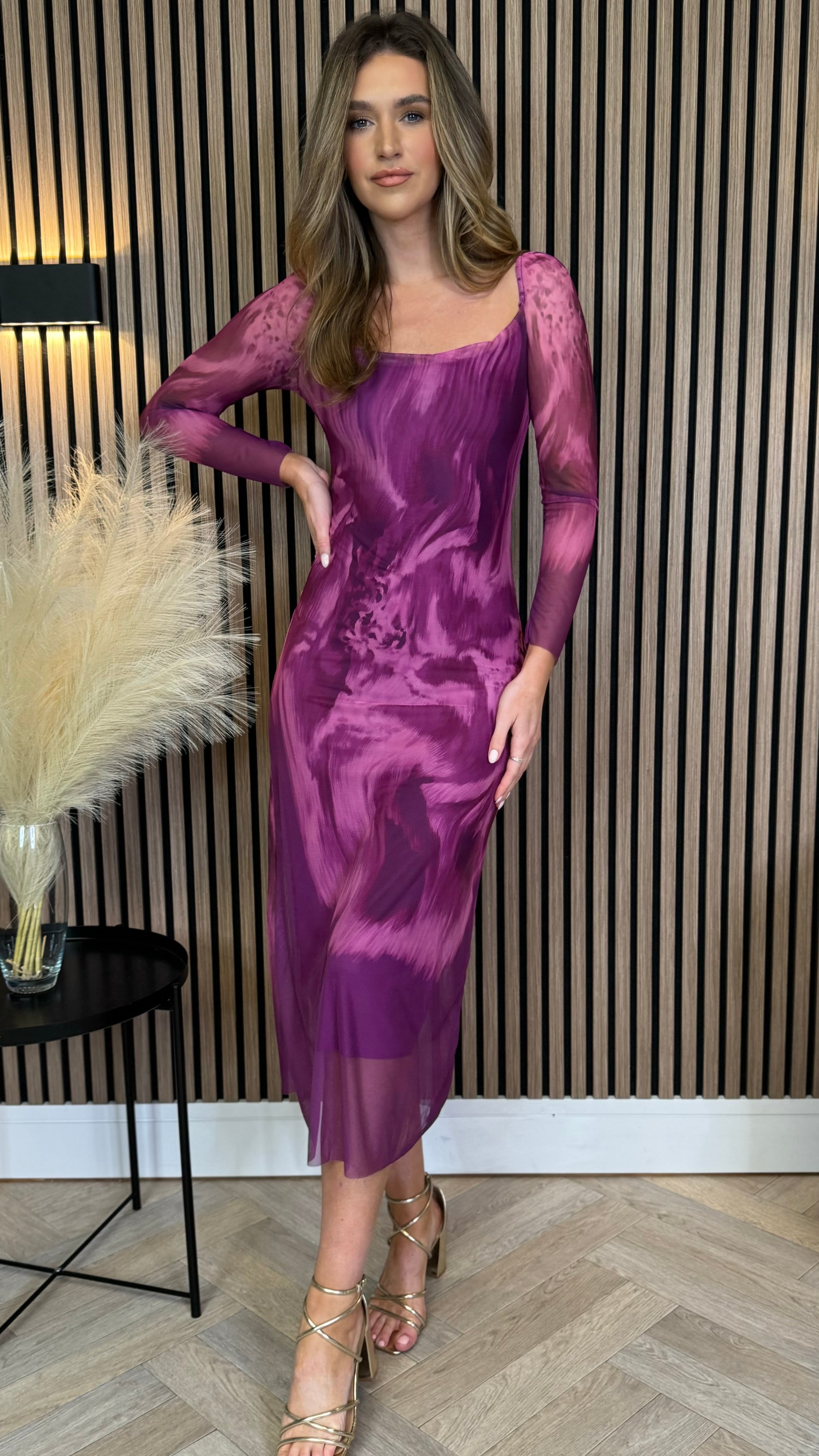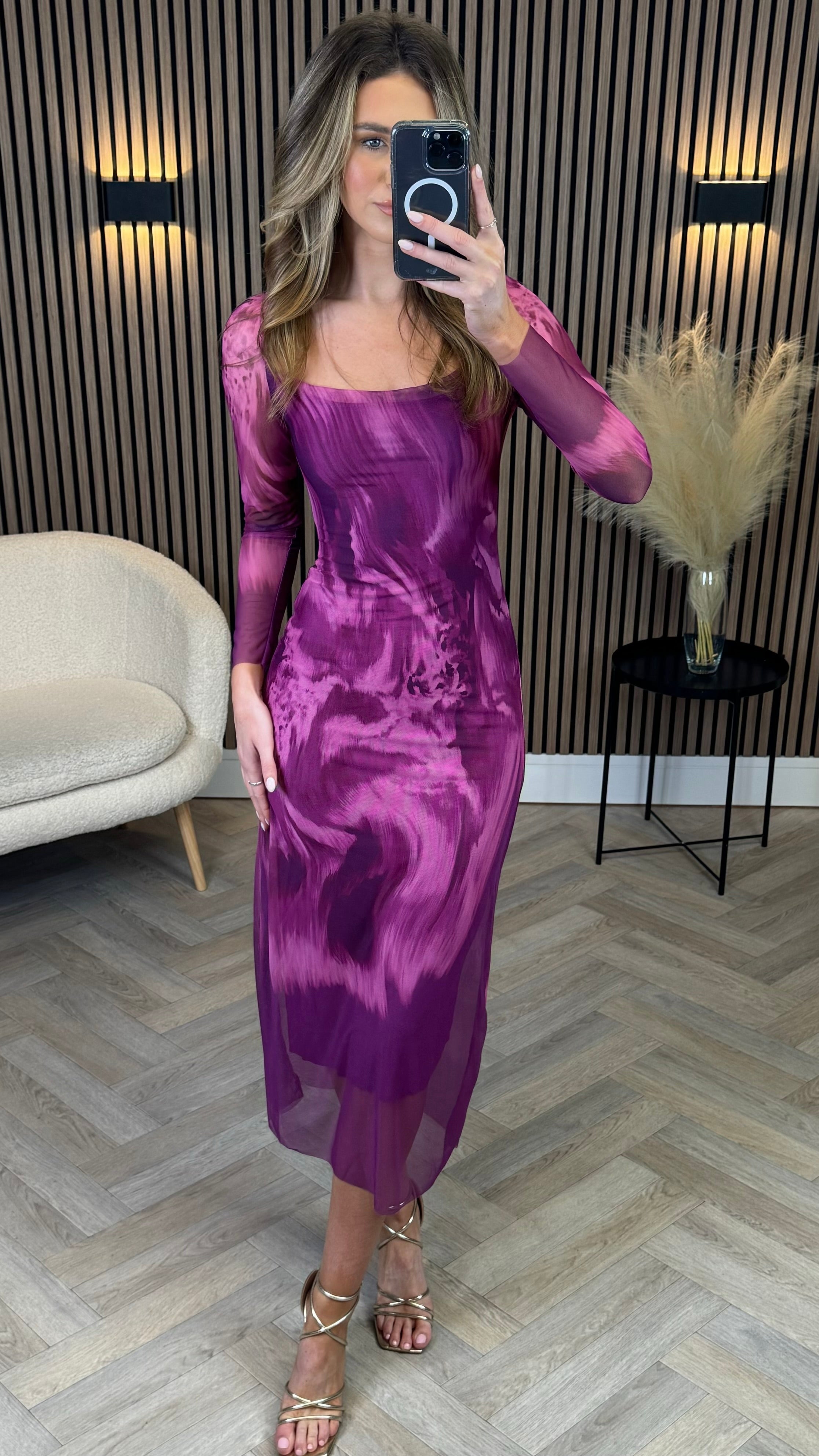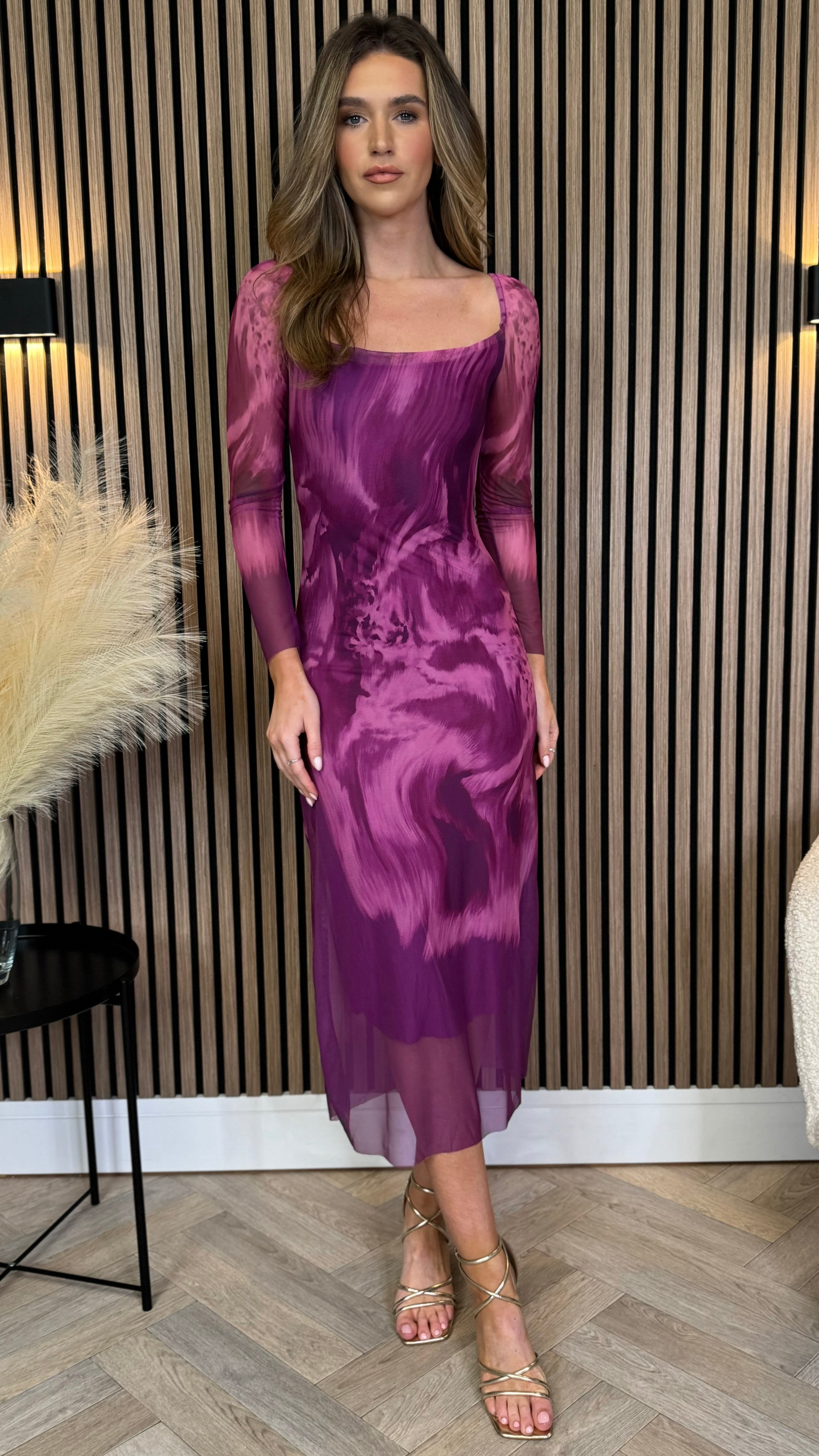 Embrace your inner fashionista with our Unabelle Purple Printed Square Neckline Midi Dress! Featuring a trendy mesh style and gorgeous purple print, this dress will make you stand out in any crowd. The wide square neckline and long sleeves add an elegant touch, making it perfect for any occasion. Elevate your wardrobe with this stylish and unique piece! 💜