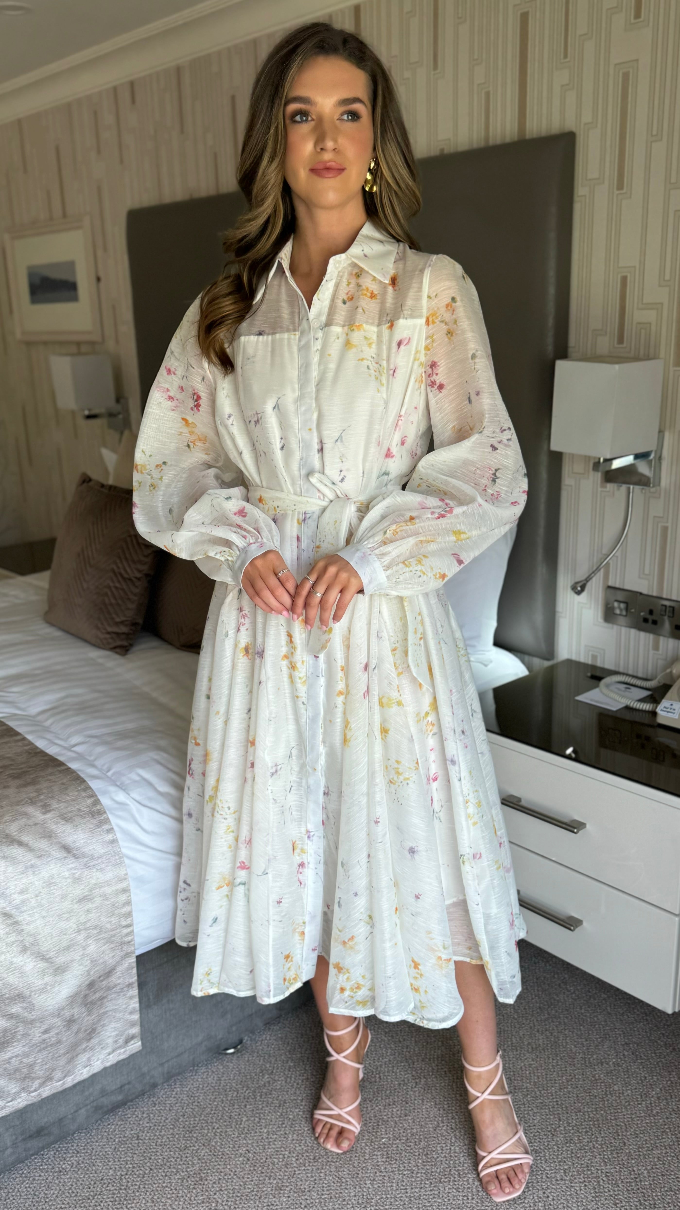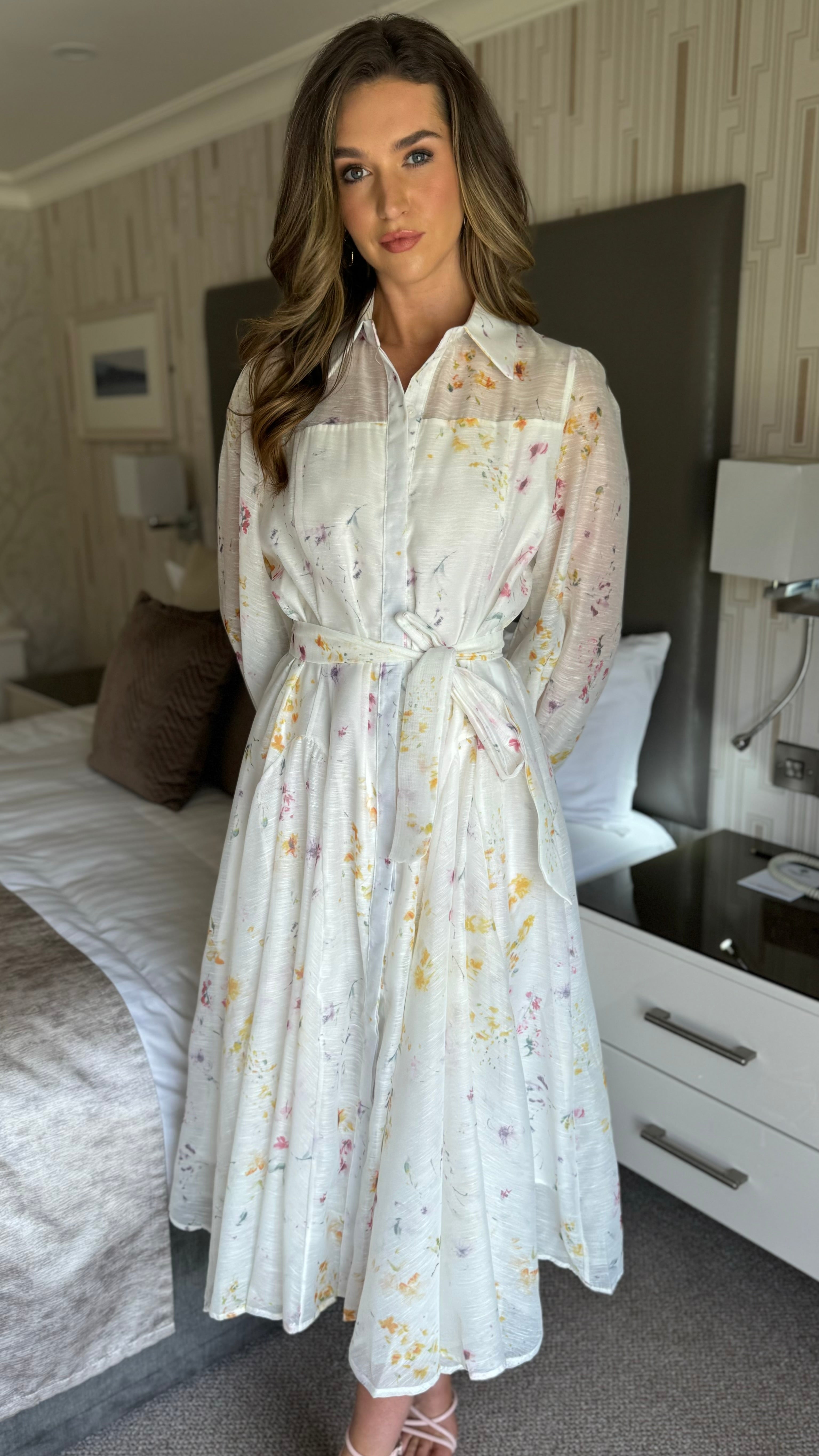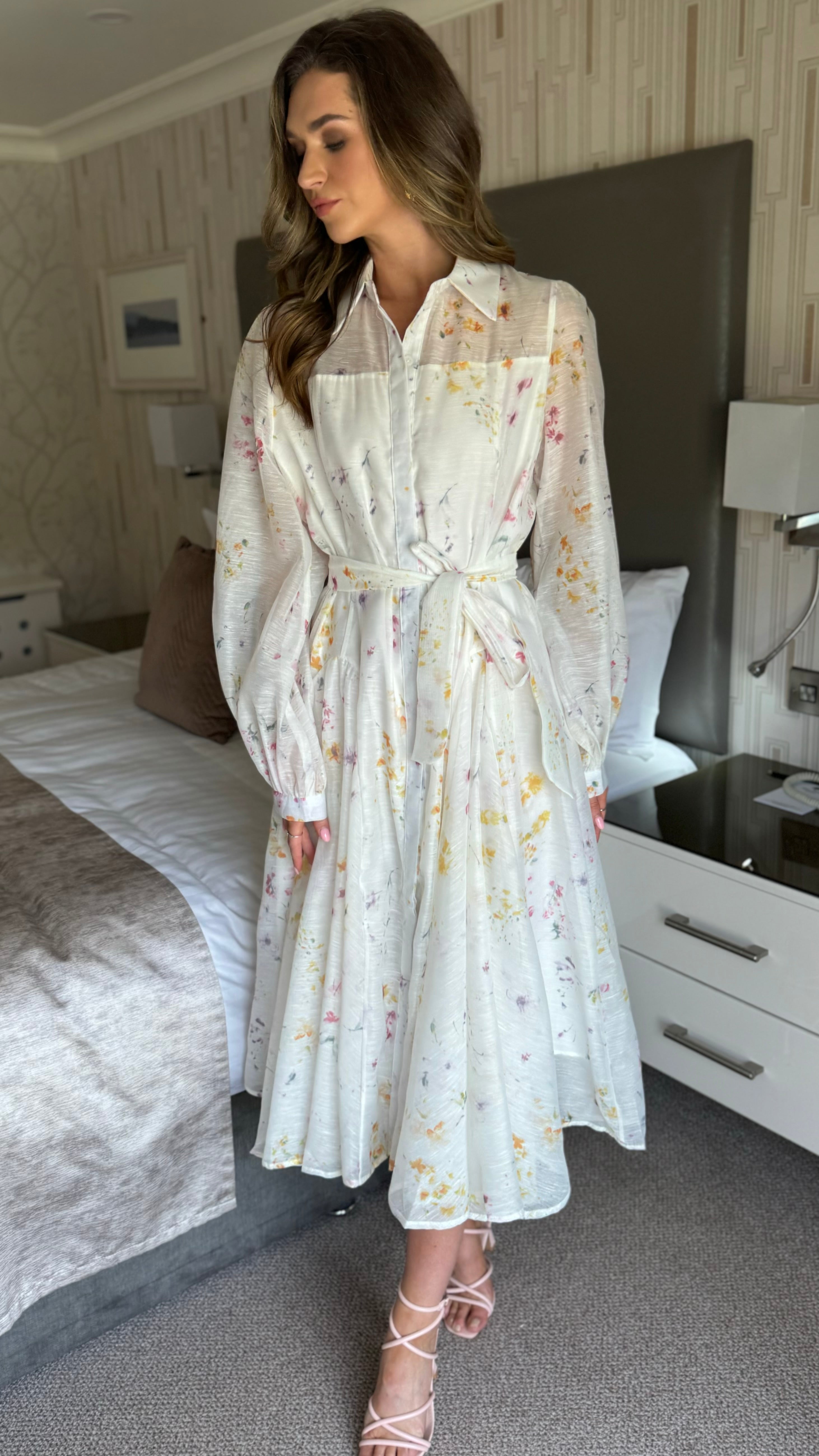 Look effortlessly chic in our Veda Button Front Belted Long Sleeve Midi Dress 🌸 This dress features a lining of organza fabric and a playful floral print, making it perfect for any occasion. The belted waist adds a touch of sophistication while the long sleeves provide comfort. Stand out in style with this eye-catching midi dress ✨