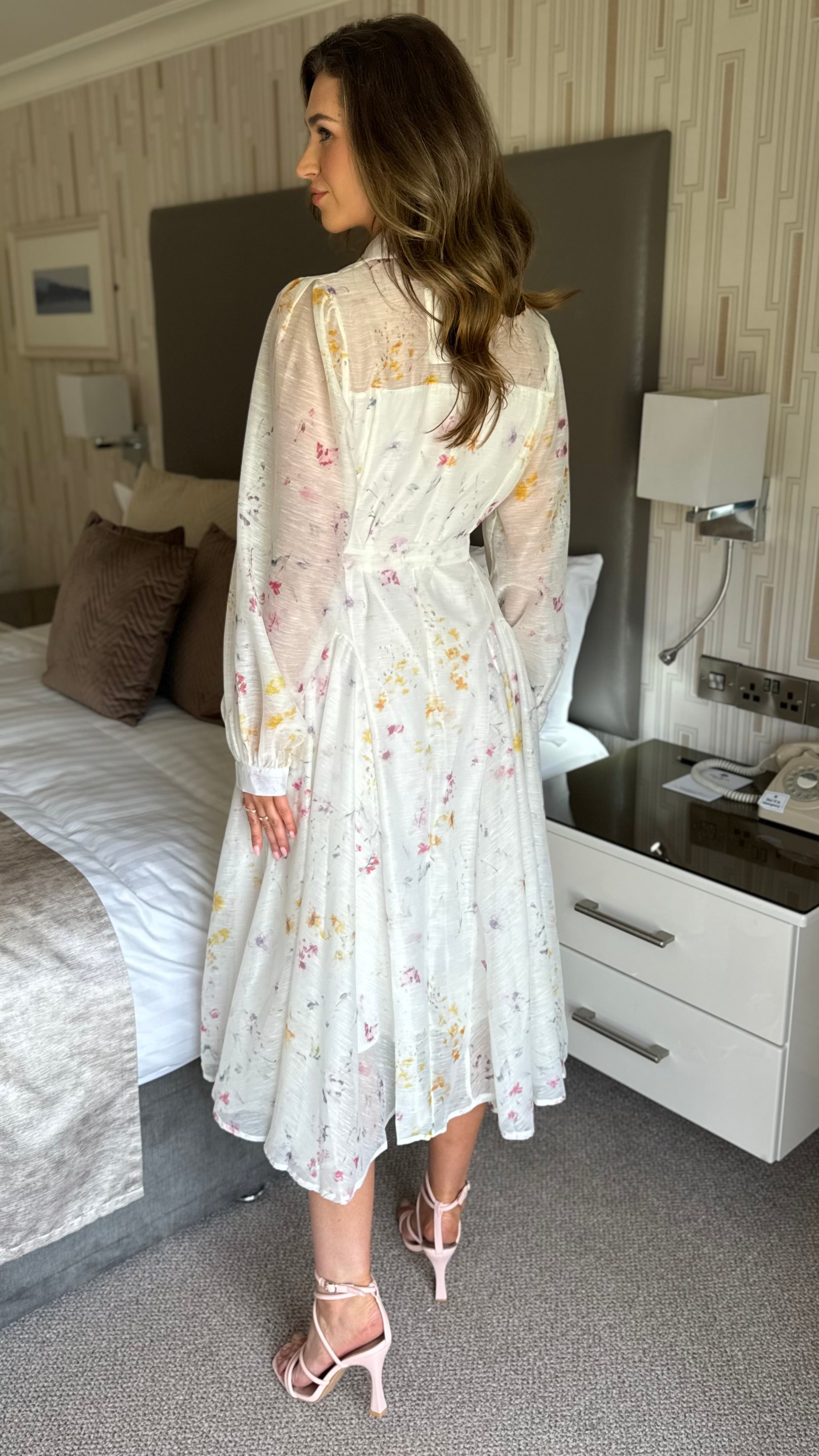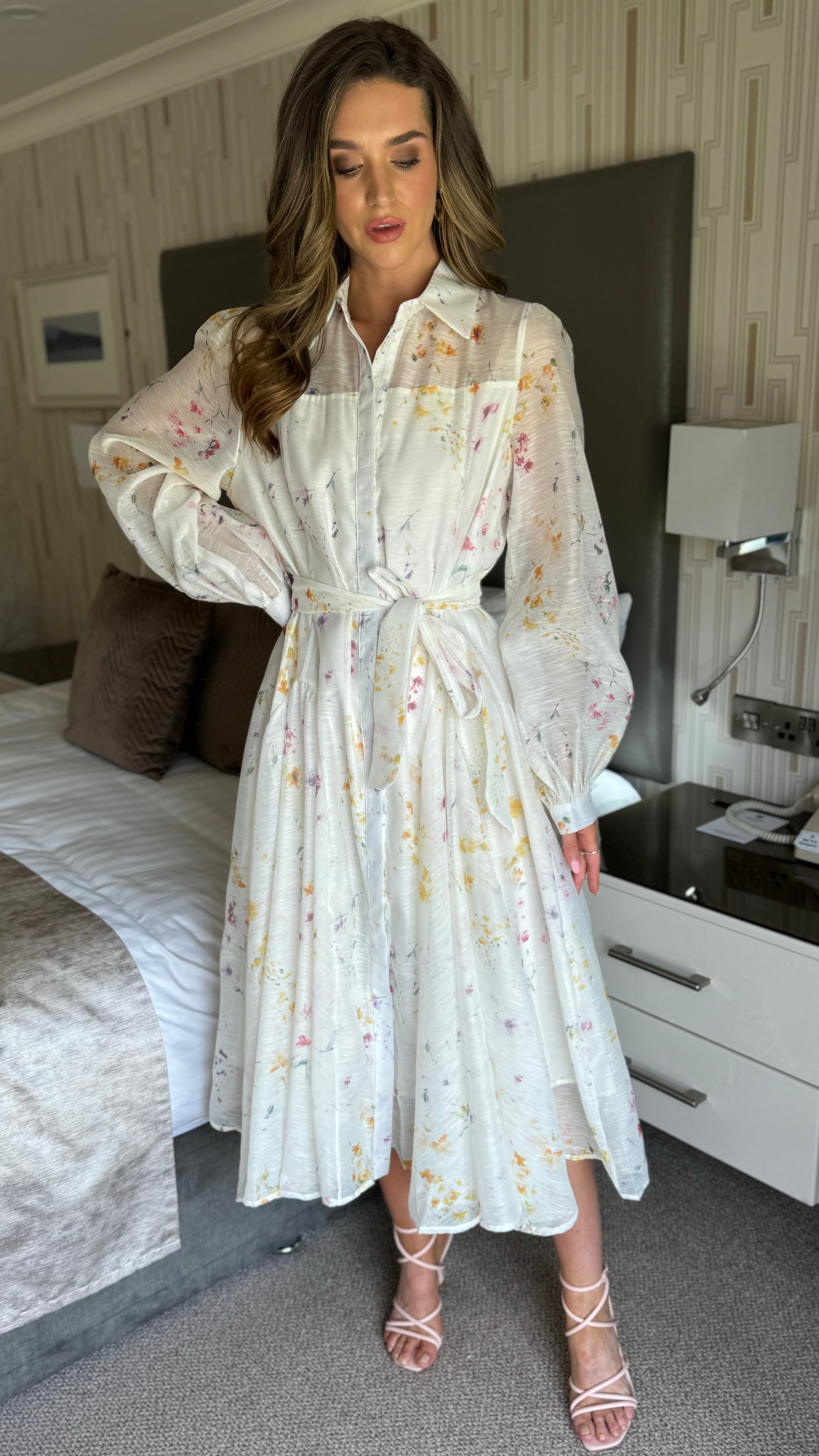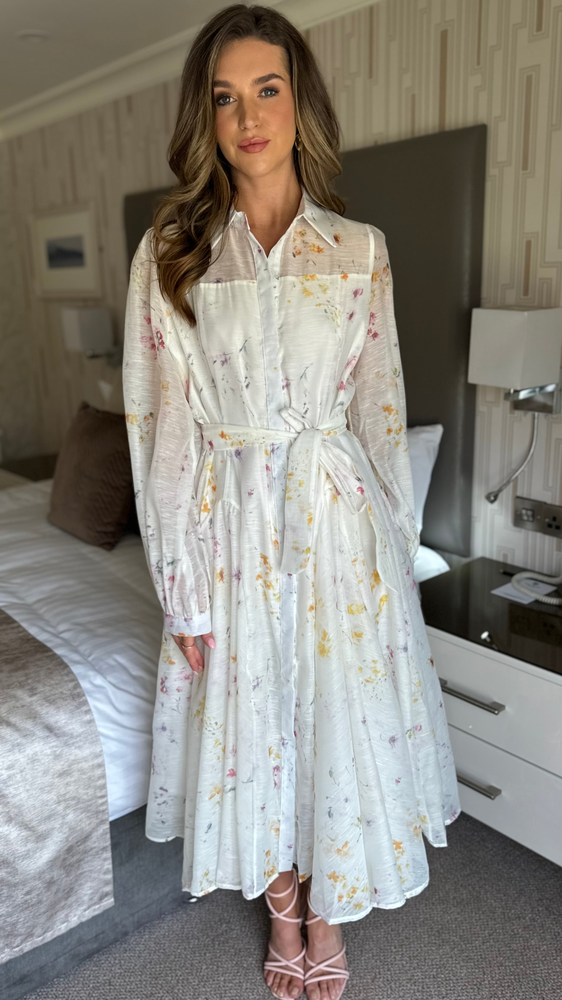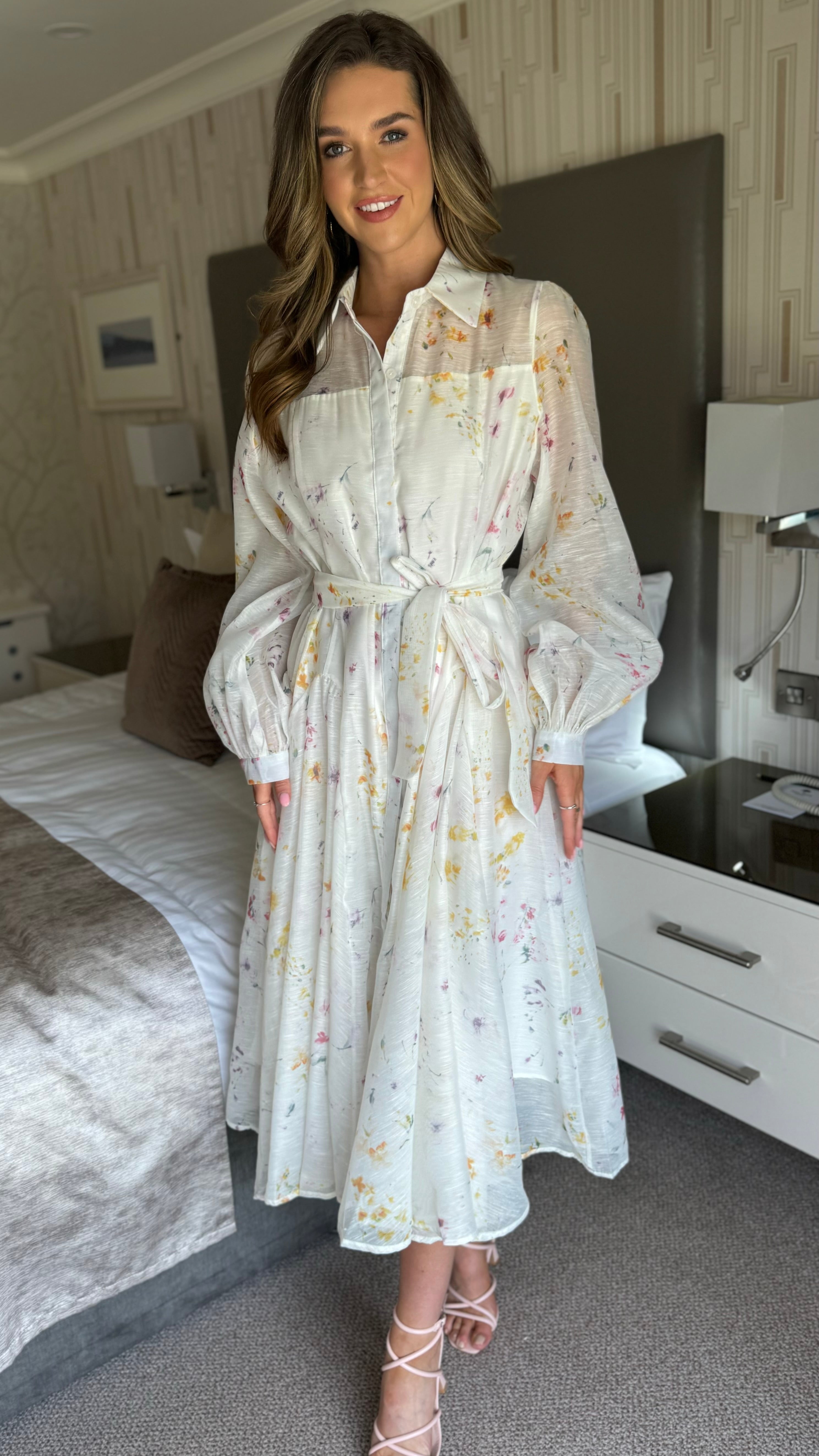 Look effortlessly chic in our Veda Button Front Belted Long Sleeve Midi Dress 🌸 This dress features a lining of organza fabric and a playful floral print, making it perfect for any occasion. The belted waist adds a touch of sophistication while the long sleeves provide comfort. Stand out in style with this eye-catching midi dress ✨