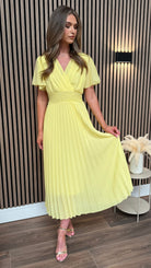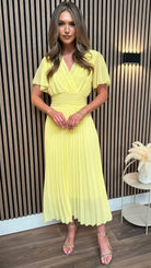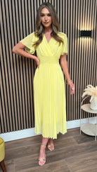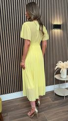 Get ready to make a statement in our Wavery Yellow Pleated V Neck Midi Dress. Featuring a unique pleated design and a playful v neck, this dress will add a touch of quirkiness to your wardrobe. Perfect for any occasion, this dress will have you feeling confident and stylish!