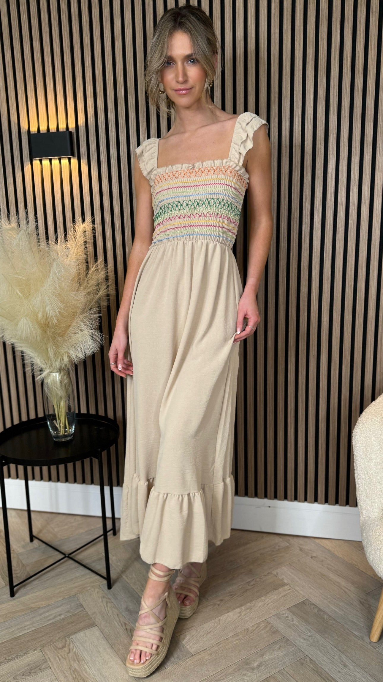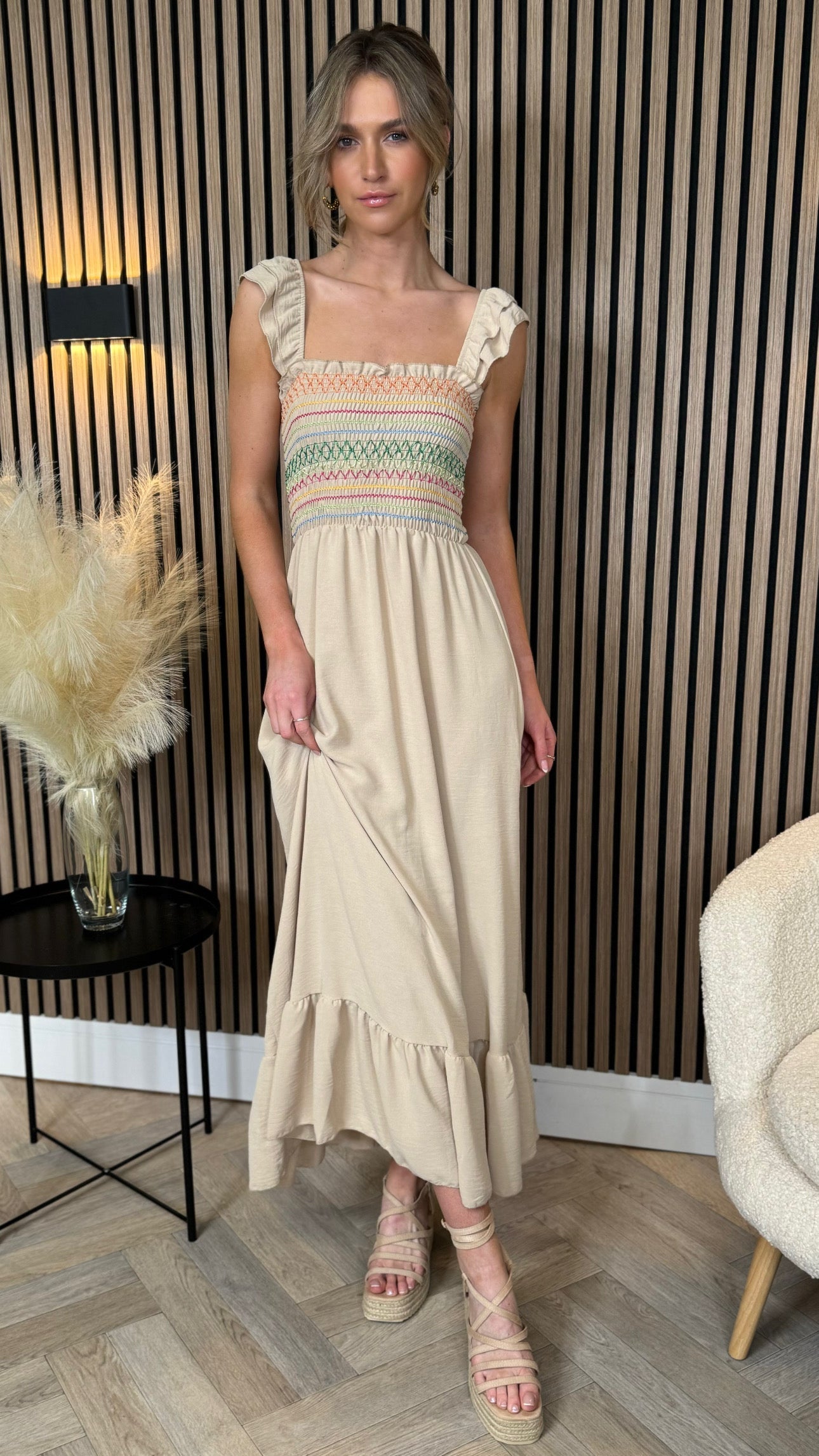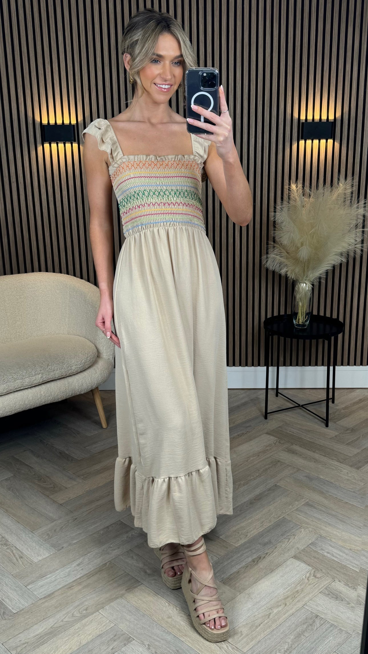 Ready to make a statement? Look no further than the Weston Beige Multi Printed Bodice Detail Midi Dress! 🌟 With its eye-catching design and playful elasticated bodice, this dress is sure to turn heads. Complete with wide sleeves for a touch of flair, it's a must-have for any fashion lover.