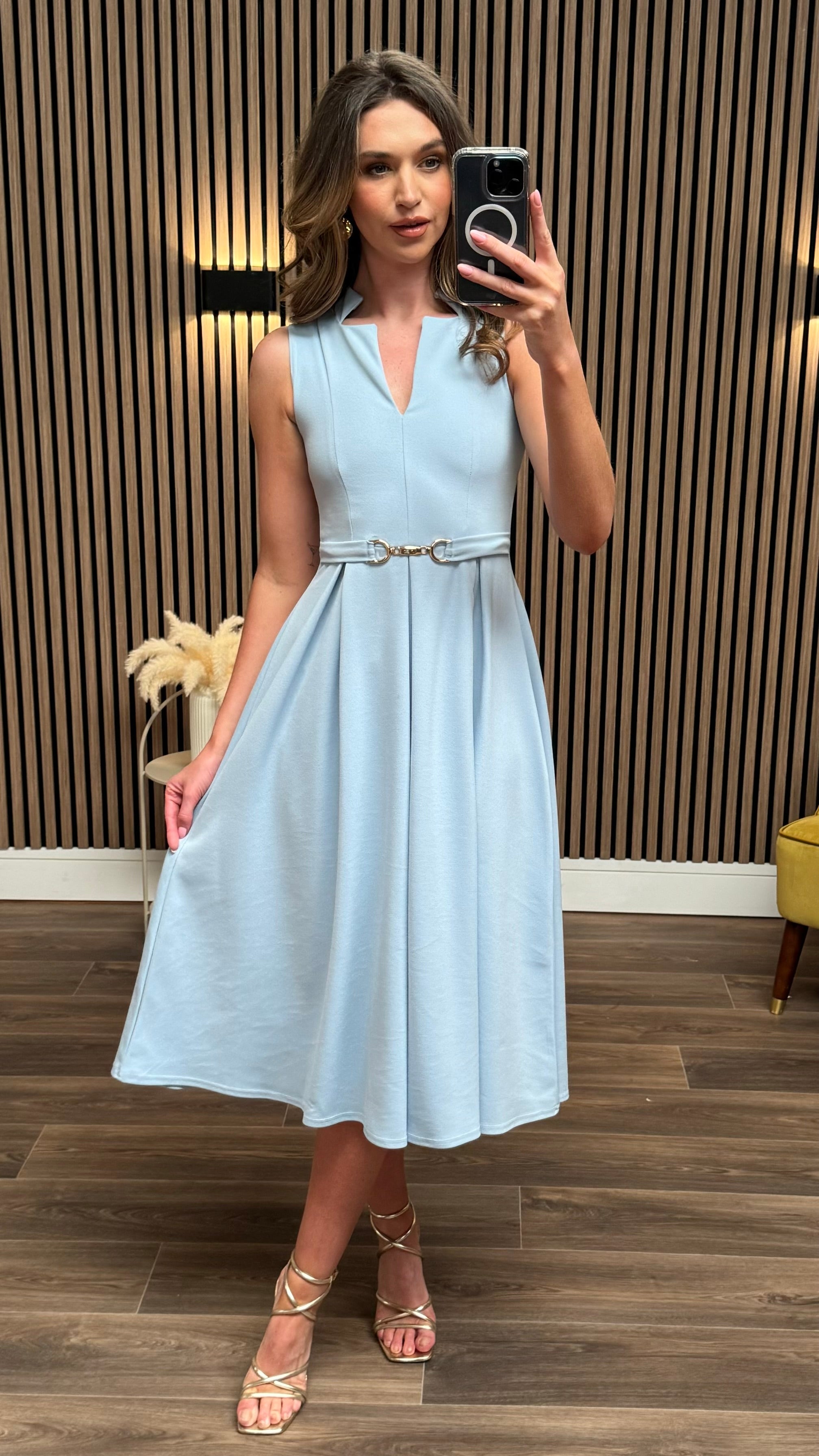 Elevate your style game with the Wyatt Light Blue Notch Neck Sleeveless Midi Dress 💁♀️ Flaunting a unique buckle and a flattering skater skirt, this dress exudes femininity and sophistication. The notch neck adds an exclusive touch to this must-have piece. Indulge in luxury and elevate your wardrobe now 🌟