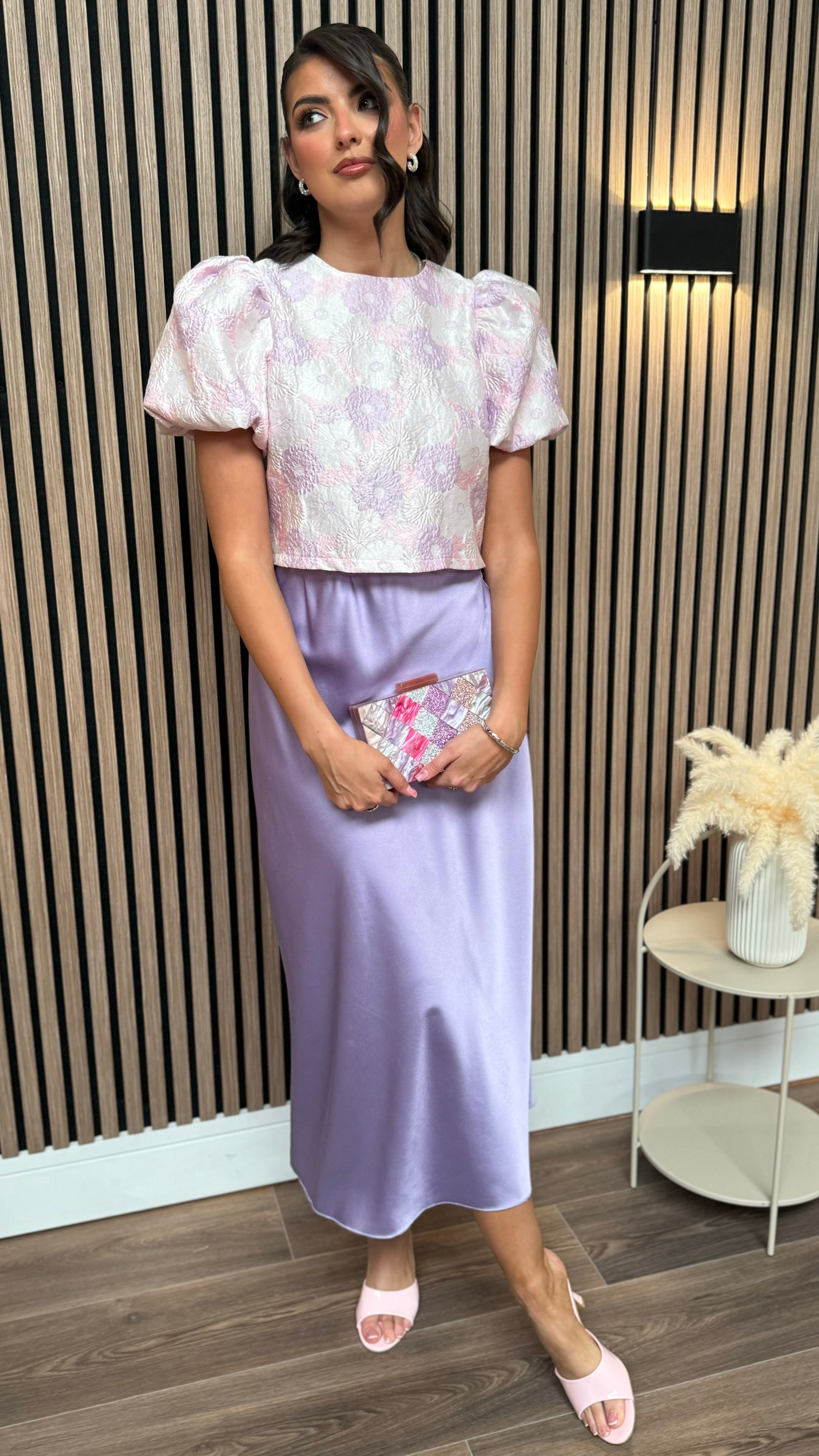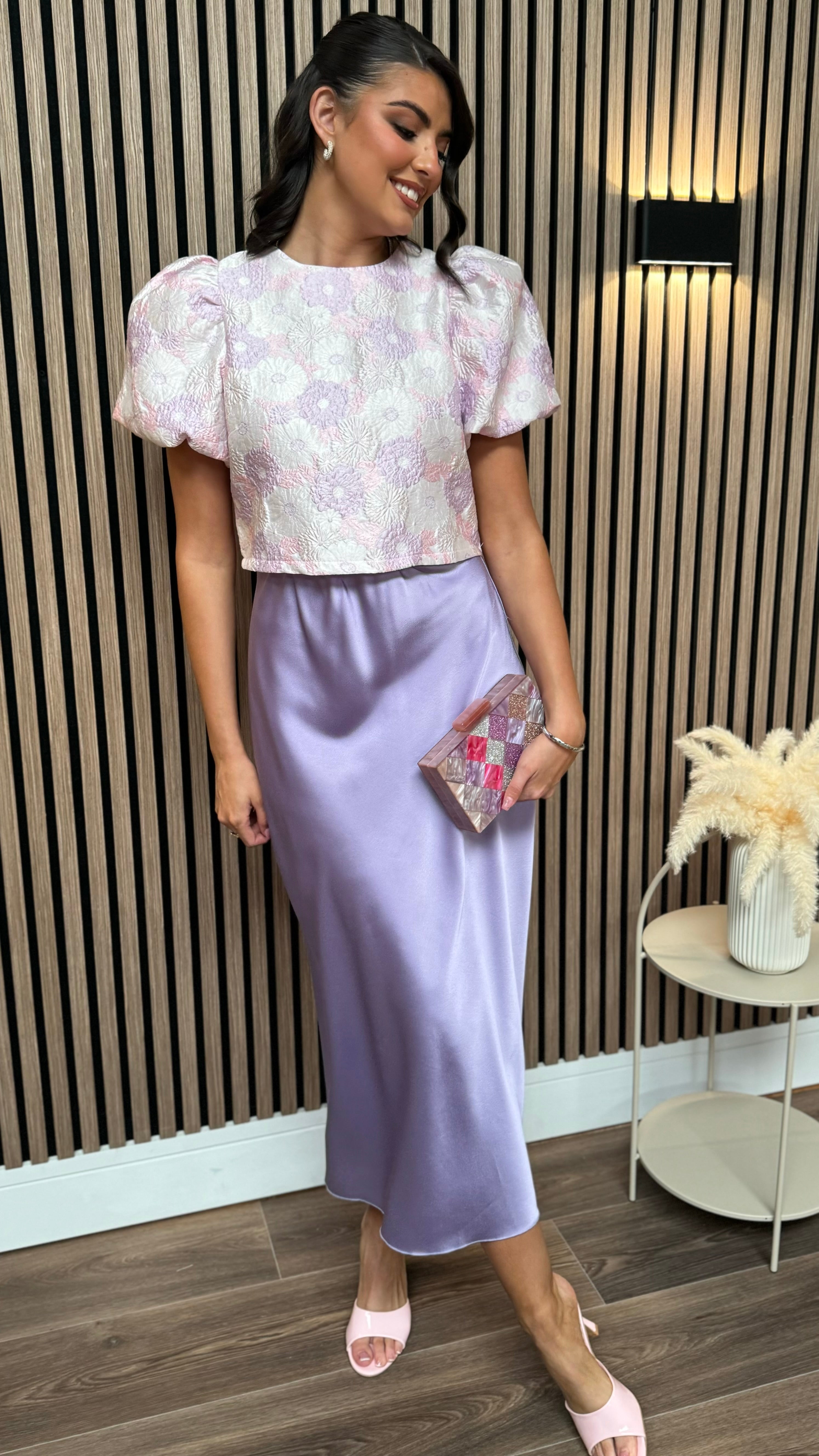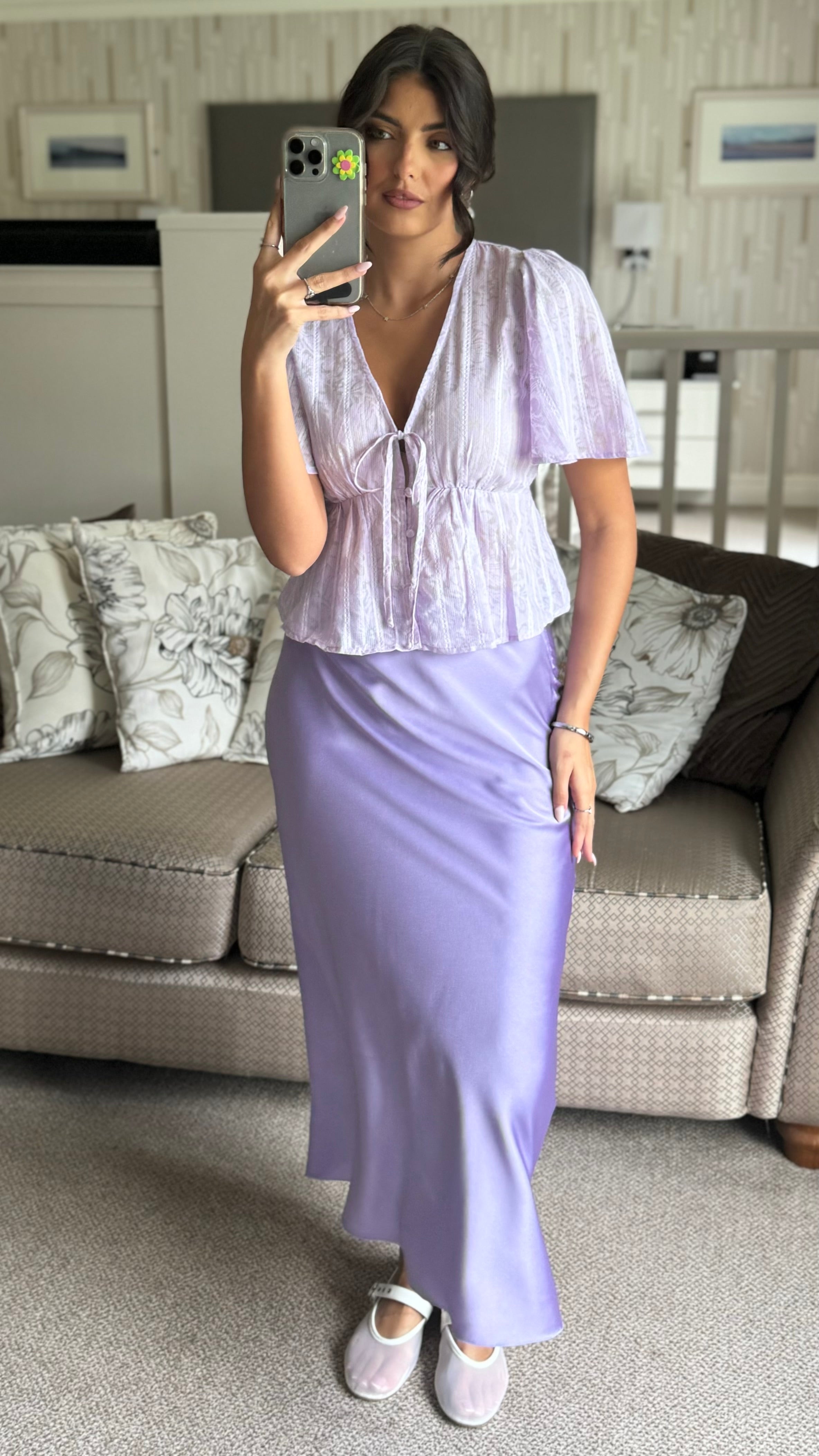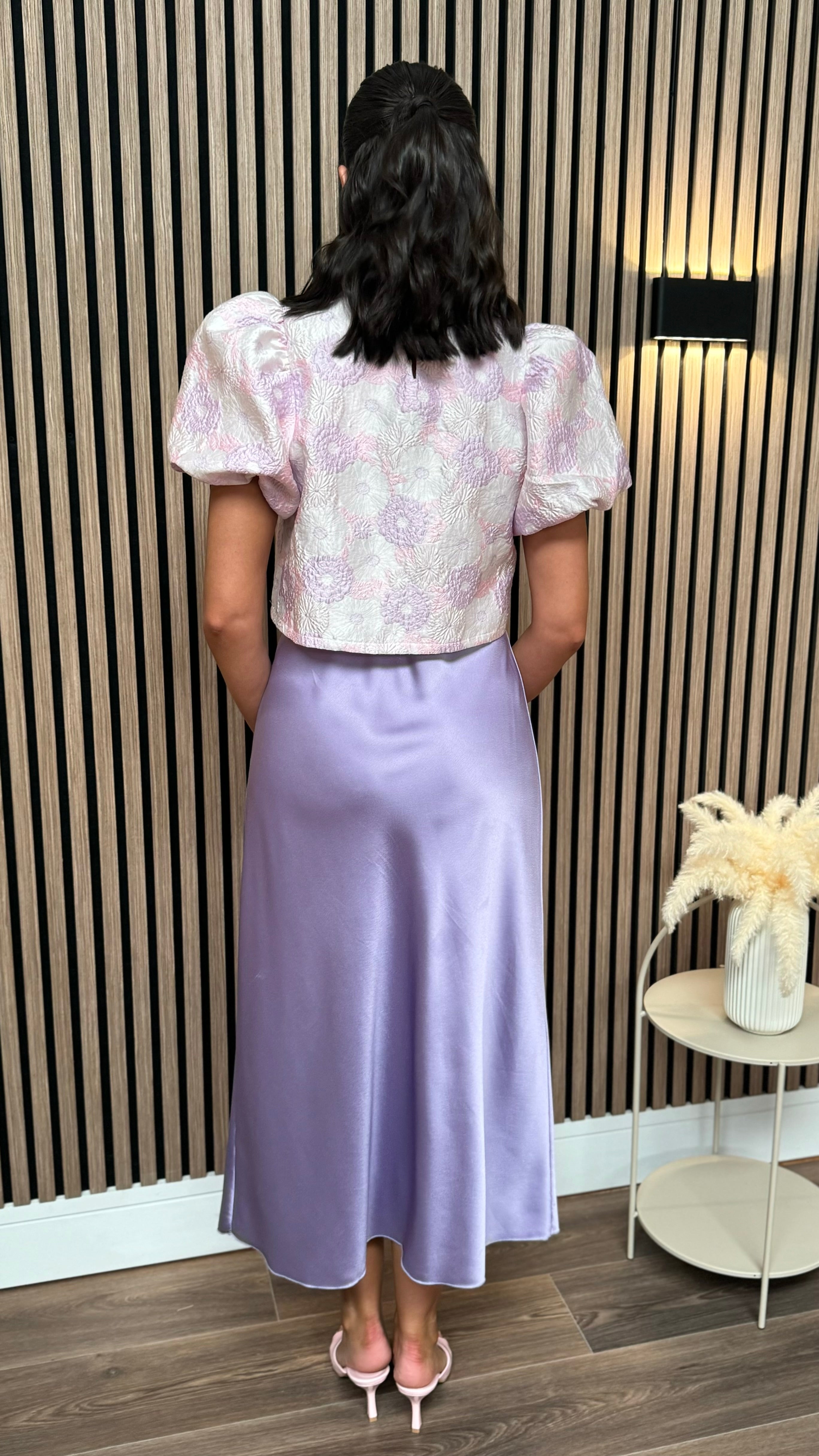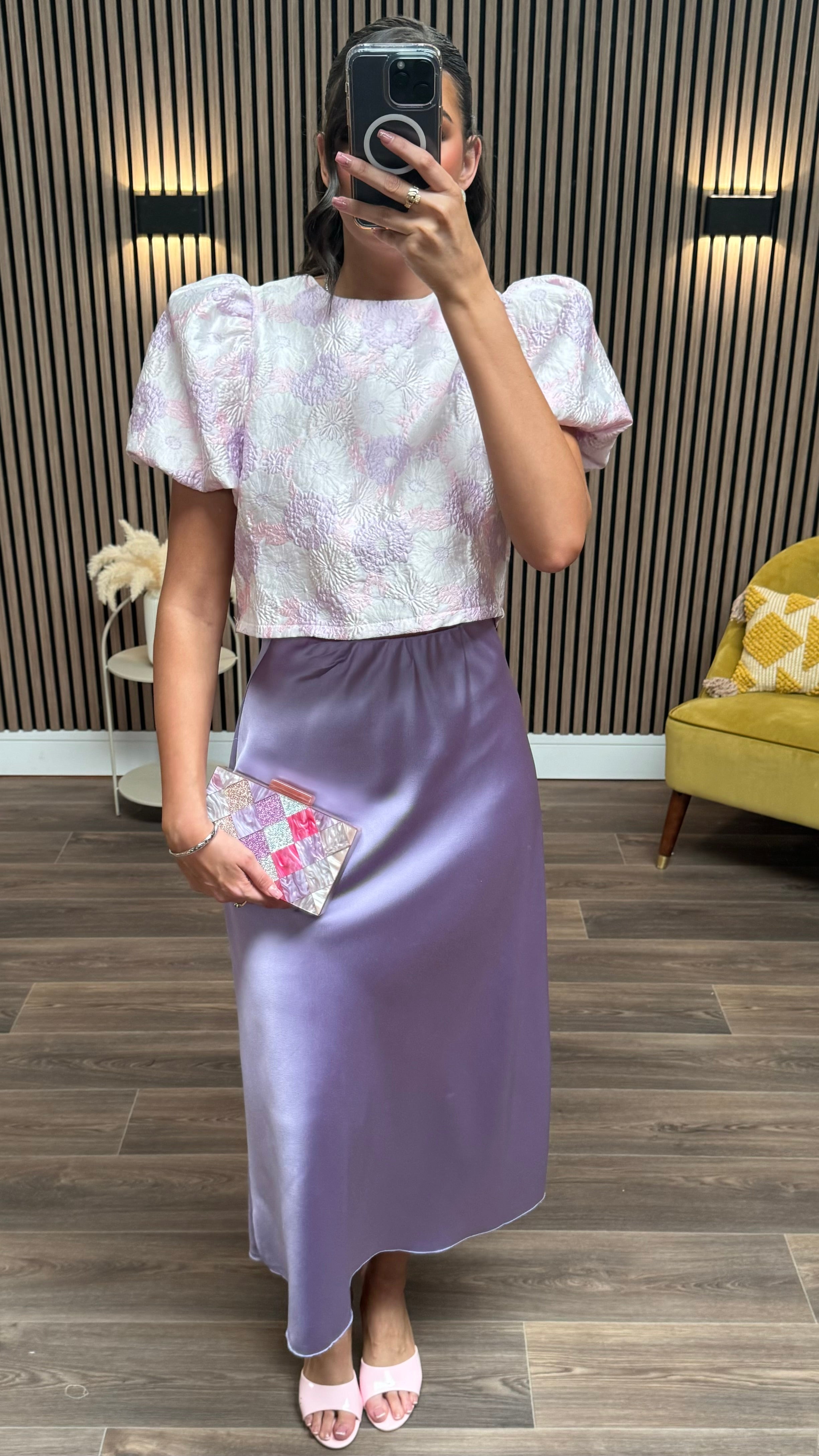 Make an impact in this stunning Yaella Lilac Midi Skirt. Crafted with a sleek, lilac fabric, this midi skirt adds a sophisticated edge to any look. Show off your style and confidence with this eye-catching piece! 💃🏻