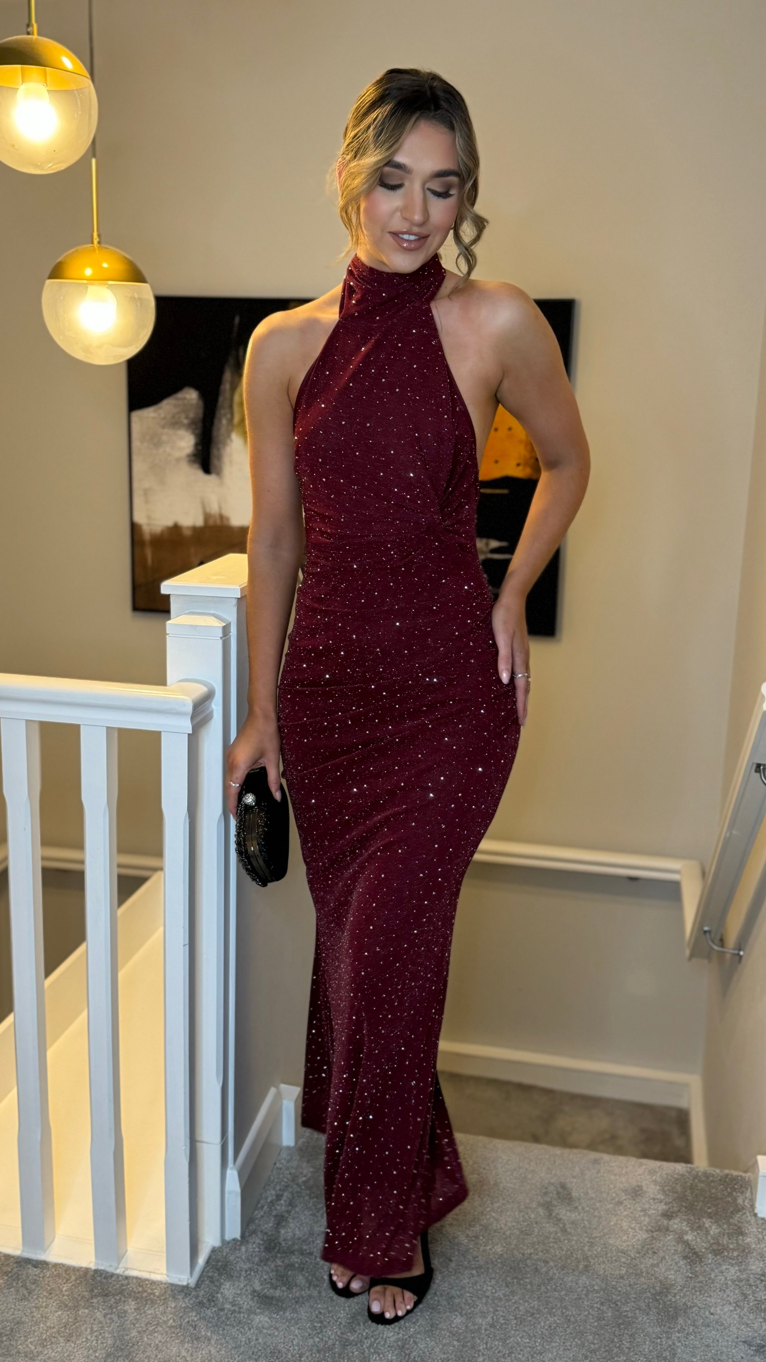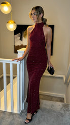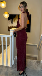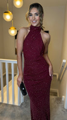 Zelda Burgundy Sparkle Halter Neck Maxi Dress