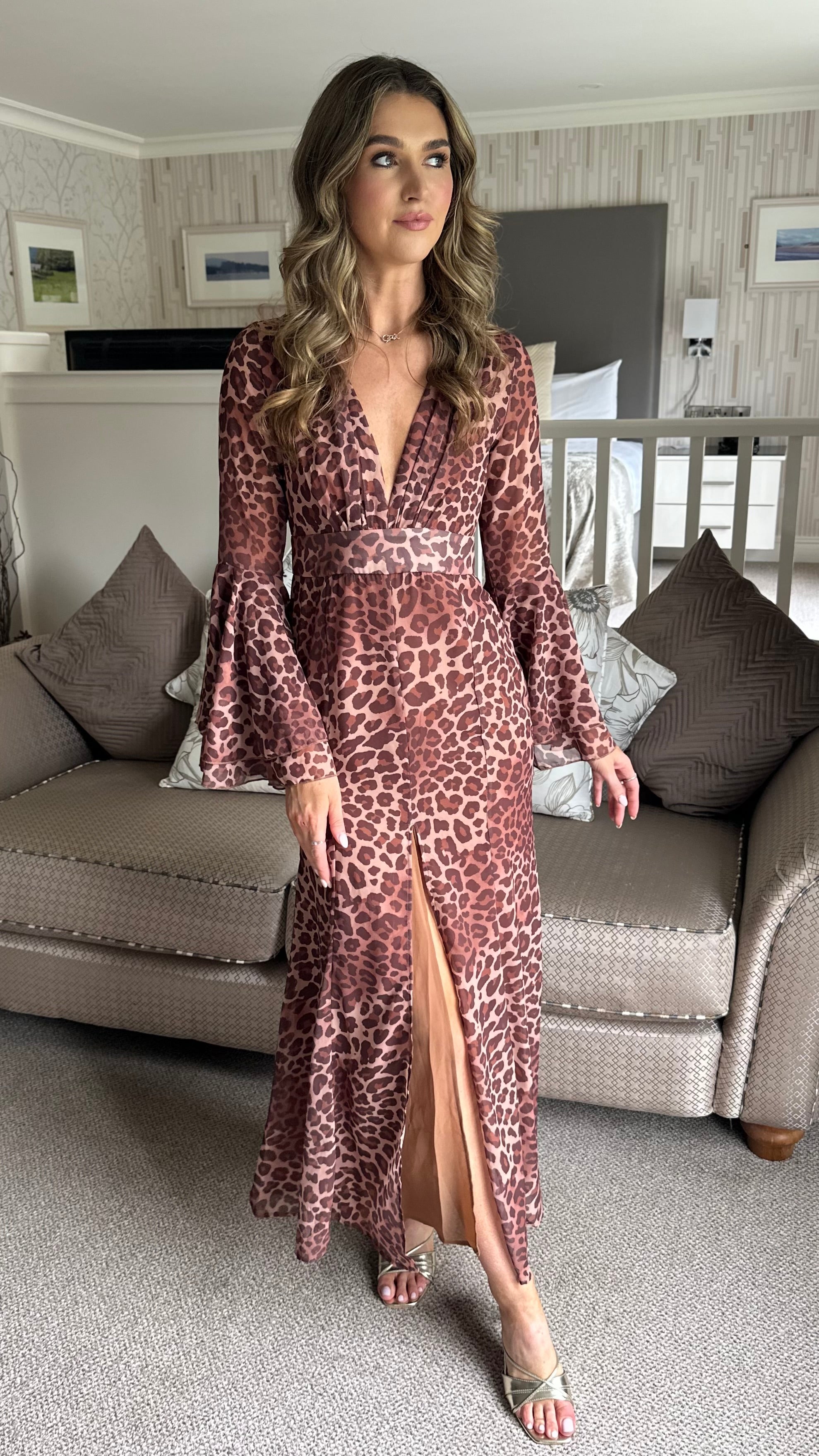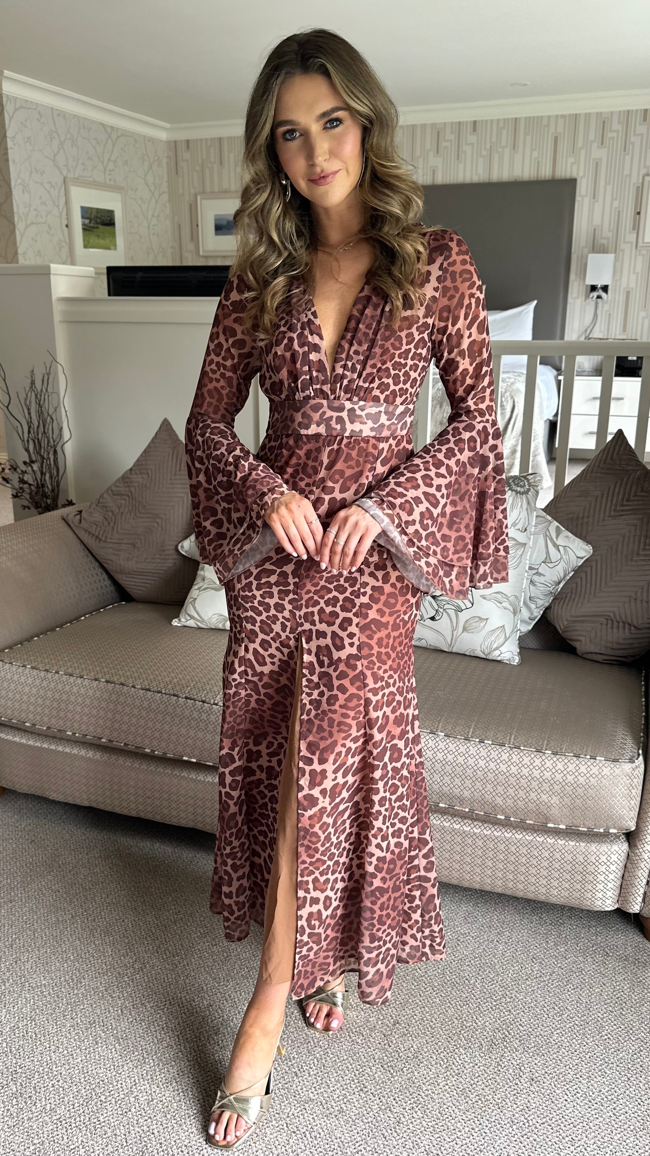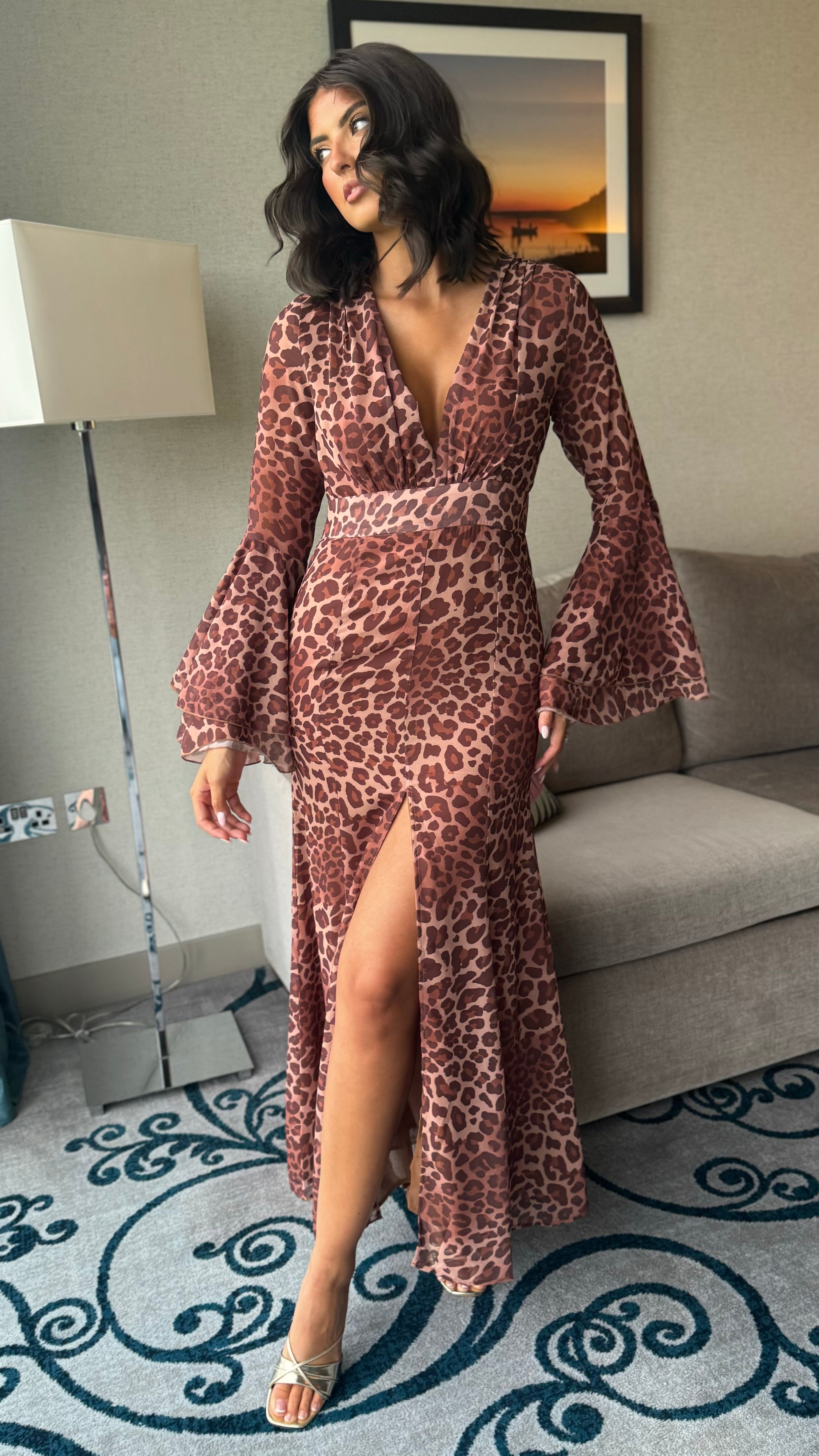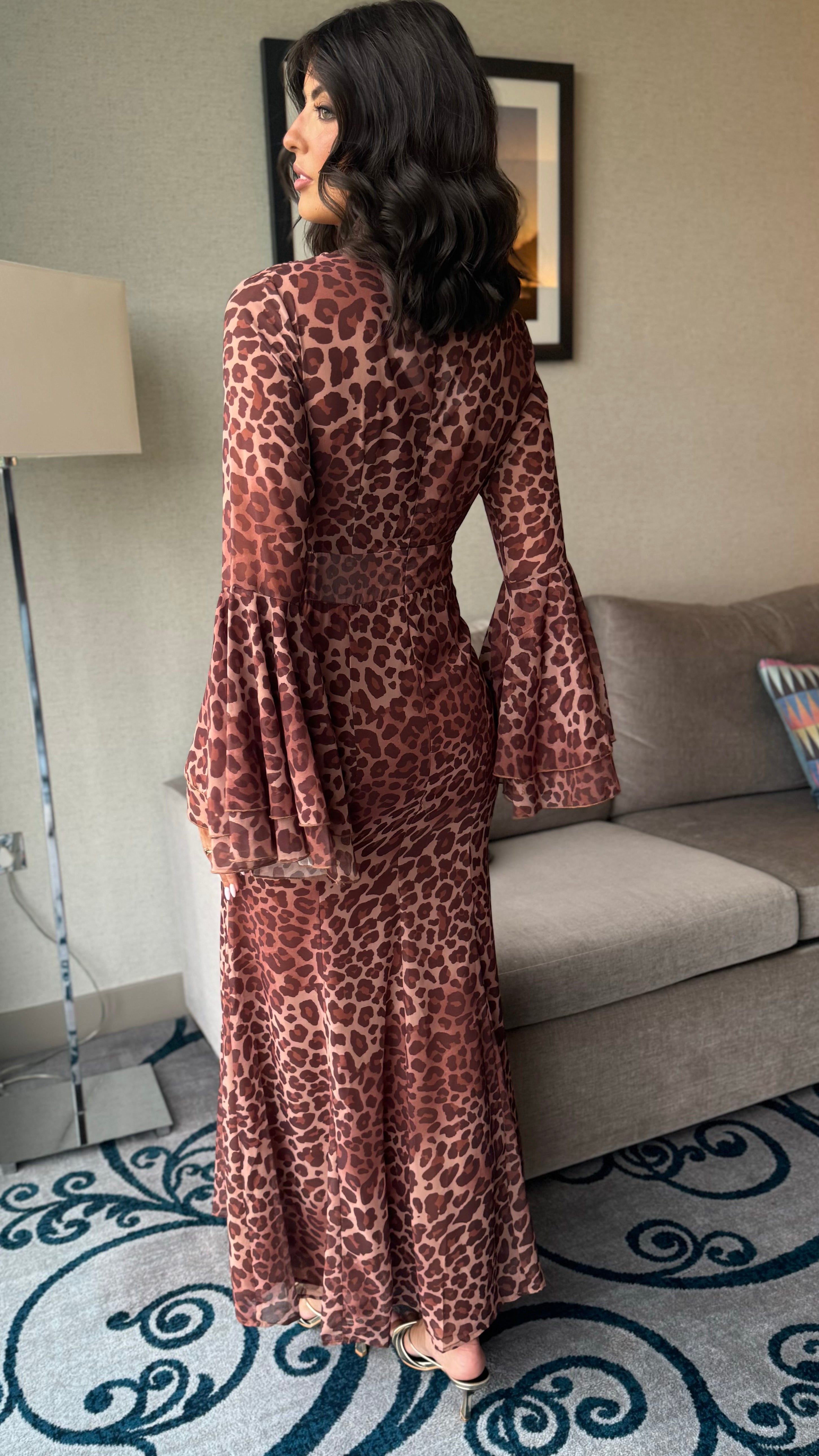 Zuri Brown Leopard Print V-Neck Bell Sleeve Maxi Dress